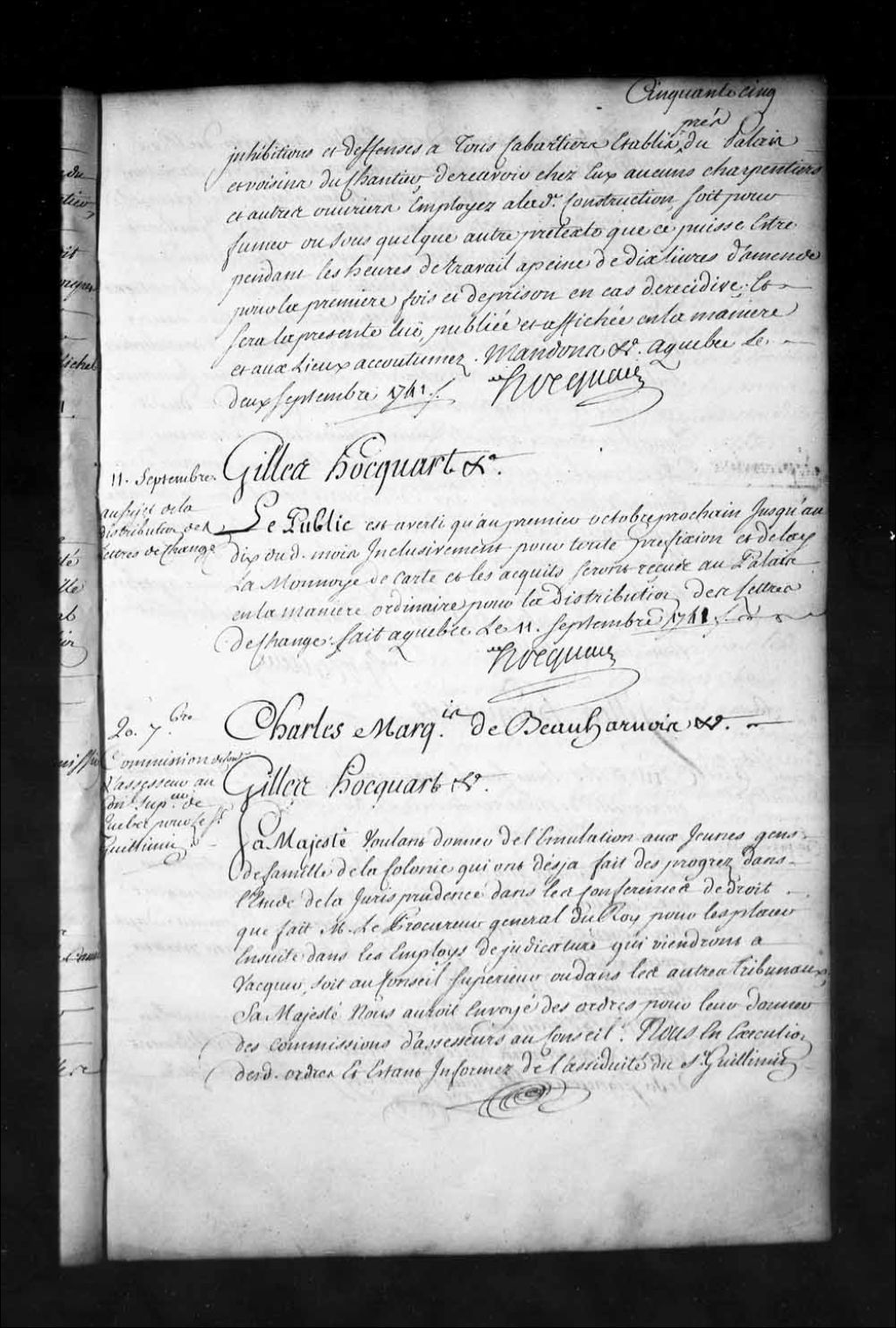 Ordonnance de l'intendant Hocquart qui avertit le public que du 1er au 10 octobre prochain inclusivement la monnaie de carte et les acquits seront reçus au Palais de l'intendant à Québec en la manière ordinaire pour la distribution des lettres de change