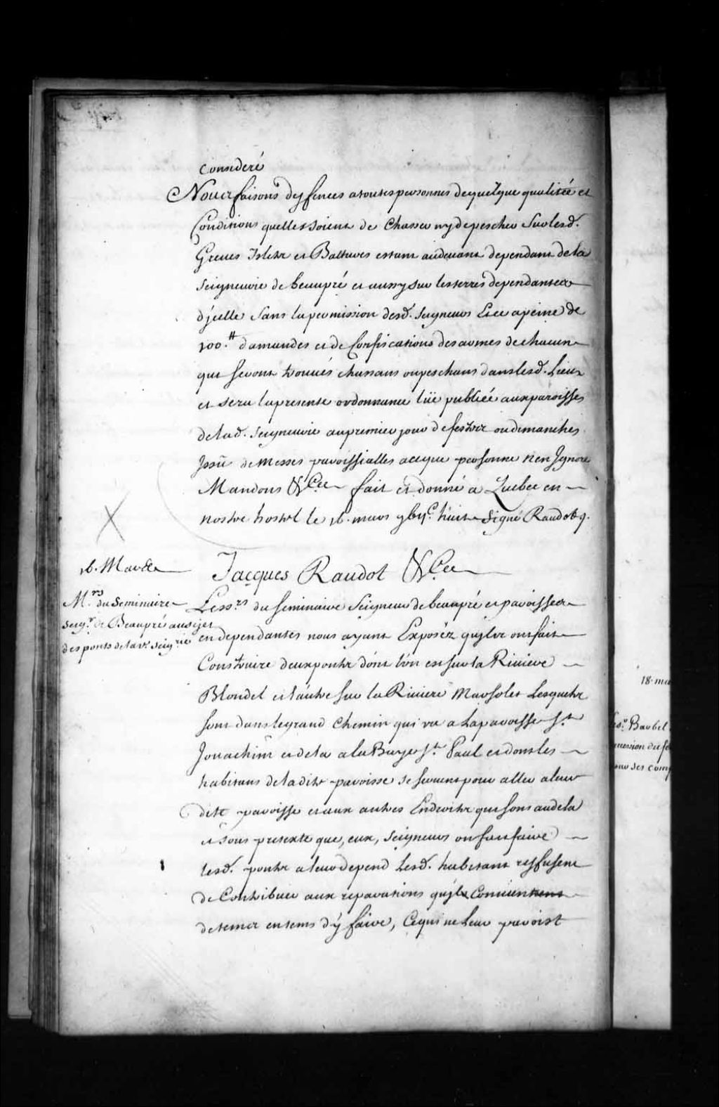 Ordonnance de l'intendant Jacques Raudot qui condamne les habitants de la seigneurie de la Côte-de-Beaupré à contribuer de leur travail conjointement avec les Messieurs du Séminaire de Québec aux réparations des deux ponts qu'ils ont fait construire, l'un sur la rivière Blondel et l'autre sur la rivière Marsolet, lesquels sont dans le grand chemin qui va à la paroisse Saint-Joachim et de là à la Baie-Saint-Paul
