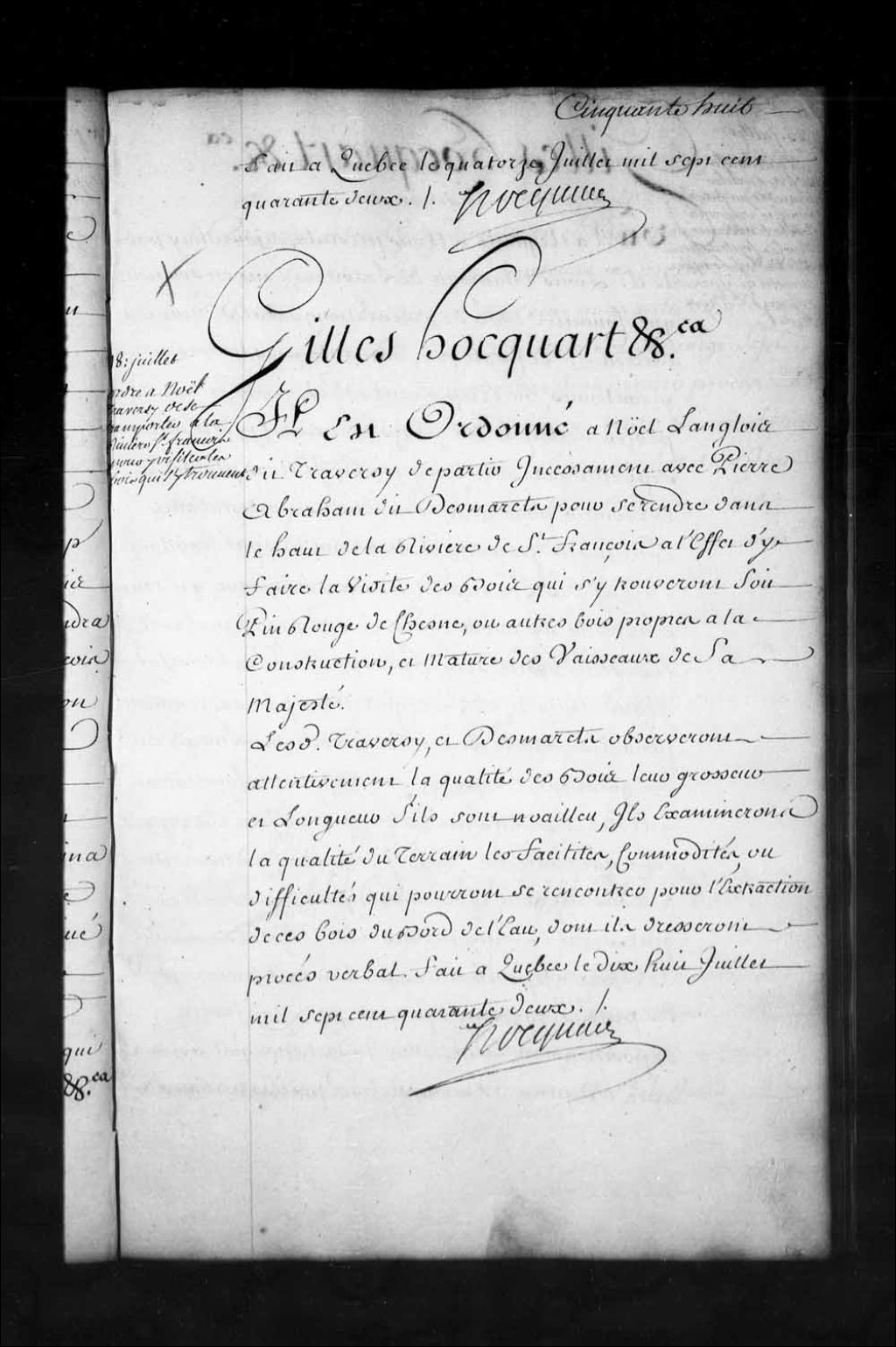 Ordonnance de l'intendant Hocquart qui commet Noël Langlois dit Traversy et Pierre Abraham dit Desmarais pour se rendre dans le haut de la rivière de Saint-François, à l'effet d'y faire la visite des bois qui s'y trouveront, soit pin rouge, de chêne ou autres bois propres à la construction et mâture des vaisseaux de Sa Majesté, 18 juillet 1742, Archives nationales à Québec, Fonds Intendants, (03Q,E1,S1,D30,P3421).