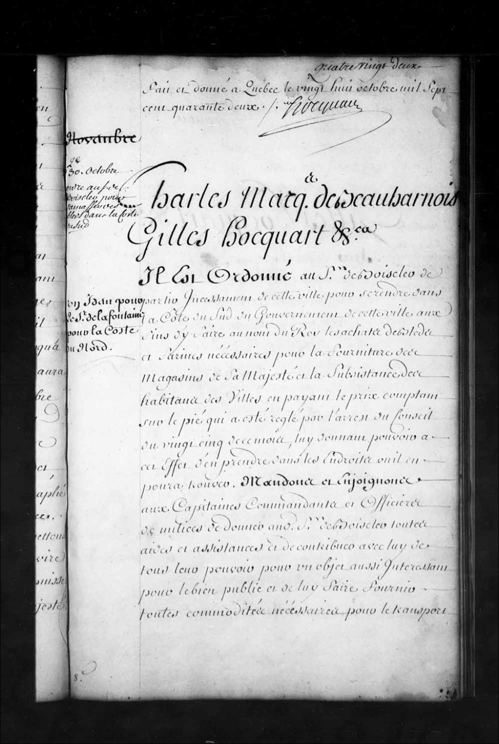 Ordre par l'intendant Hocquart au sieur Lanoullier (Lanouiller) de Boiscler de partir incessamment de Québec pour se rendre dans la côte du Sud du gouvernement de Québec aux fins d'y faire au nom du Roi les achats de blé et farine nécessaires pour la fourniture des magasins de Sa Majesté et la subsistance des habitants des villes, 30 octobre 1742, Archives nationales à Québec, Fonds Intendants, (03Q,E1,S1,D30,P3444).