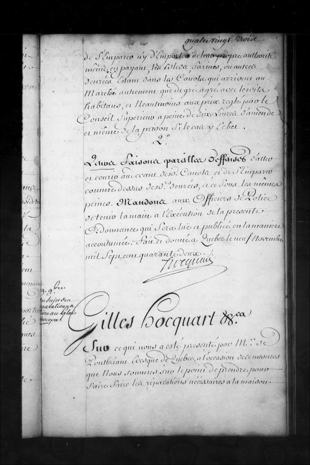 Ordonnance de l'intendant Hocquart qui porte que l'intendant se transportera incessamment avec le sieur Chaussegros de Léry et les experts nommés par l'ordonnance du 20 septembre 1741, au palais épiscopal de Québec, à l'effet de procéder à une nouvelle visite de la charpente de ladite bâtisse et dresser procès-verbal de l'état où elle est actuellement, prendre l'avis des experts, etc., pour être ordonné ce qu'il appartiendra