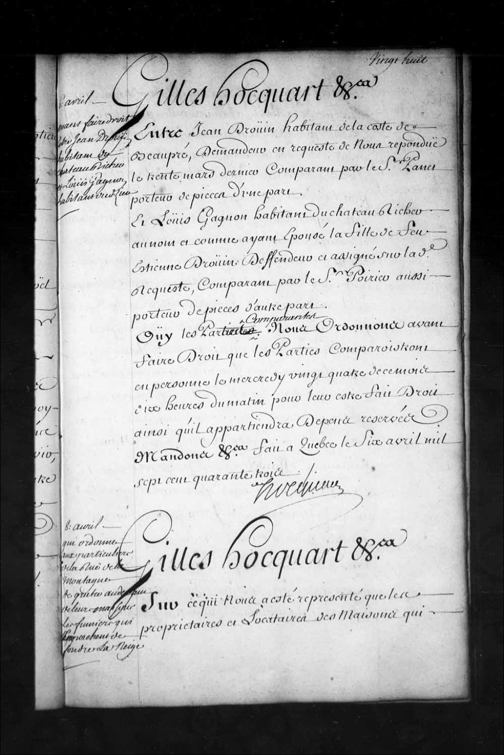 Ordonnance de l'intendant Hocquart qui oblige les propriétaires et locataires des maisons de la côte Lamontagne, à Québec, de gratter ou faire gratter chacun en droit soi au devant de son emplacement les fumiers qui couvrent le chemin et qui empêchent la neige ou la glace de fondre, 8 avril 1743, Archives nationales à Québec, Fonds Intendants, (03Q,E1,S1,D31,P3486).