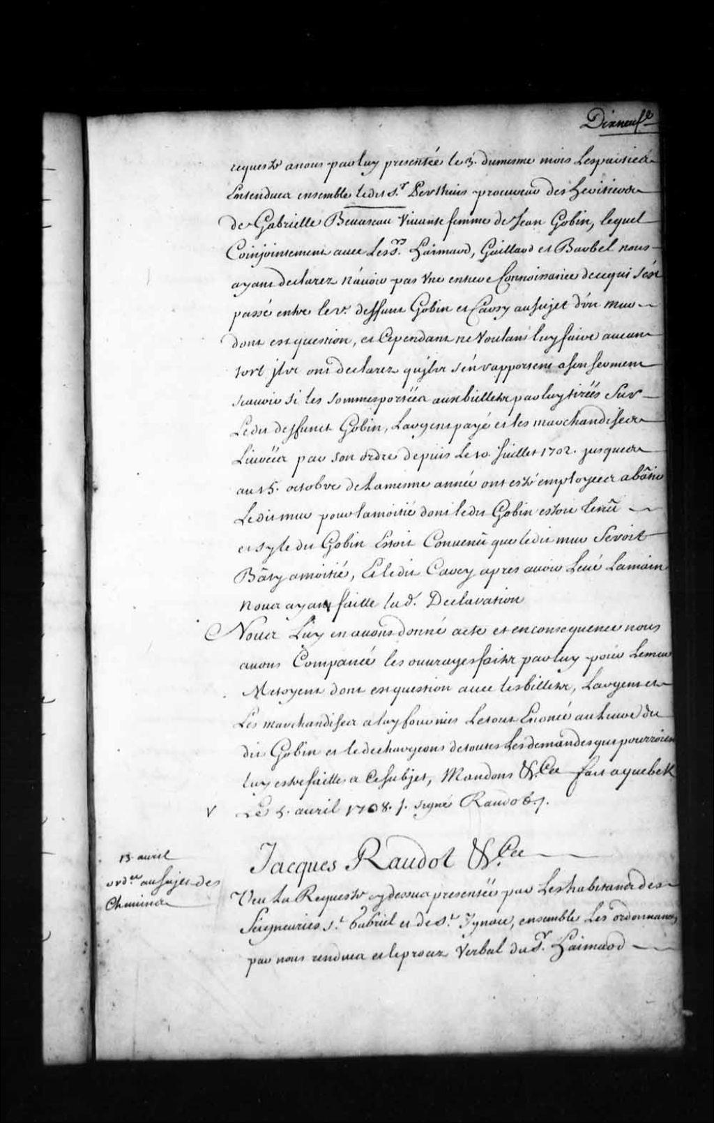 Ordonnance de l'intendant Jacques Raudot au sujet du grand chemin dans les seigneuries de Saint-Gabriel et de Saint-Ignace, qui sera mis en état d'y passer en tout temps par les habitants; permission de passer sur le sentier tant que la saison ne permettra pas de passer par le grand chemin, ce qui sera réglé par le sieur Boulanger, curé de Charlesbourg, bien entendu que les charrettes, harnois, chevaux et bestiaux ne pourront passer par ledit sentier, 13 avril 1708, Archives nationales à Québec, Fonds Intendants, (03Q,E1,S1,D2,P349).