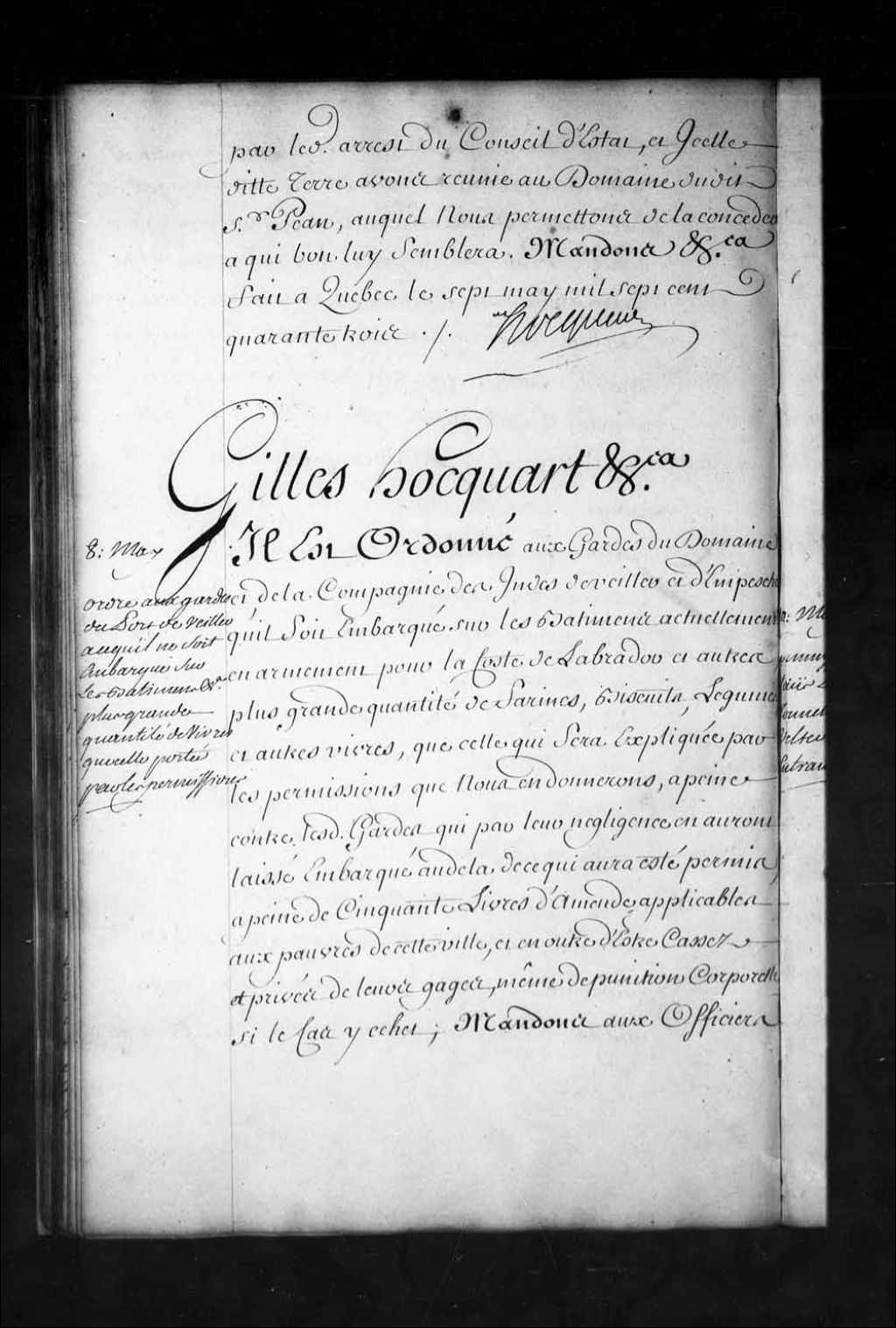 Ordonnance de l'intendant Hocquart qui prescrit aux gardes du Domaine et de la Compagnie des Indes de veiller à ce qu'il ne soit embarqué sur les bâtiments (bateaux) actuellement en armement pour la côte du Labrador plus grande quantité de vivres que celle portée par les permissions, 8 mai 1743, Archives nationales à Québec, Fonds Intendants, (03Q,E1,S1,D31,P3495).