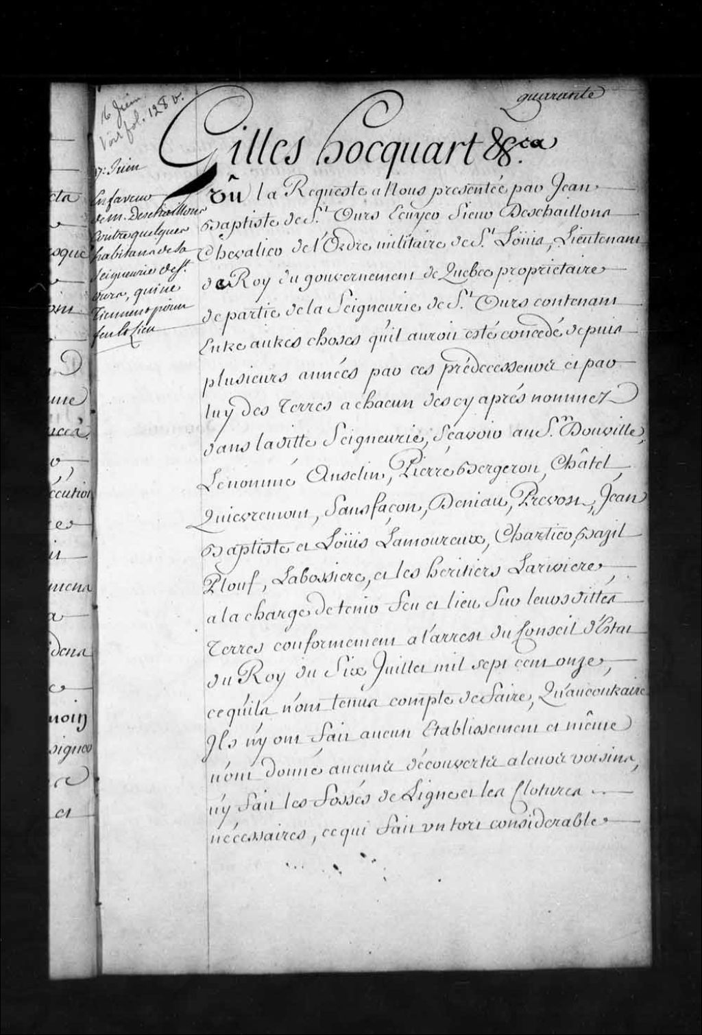 Ordonnance de l'intendant Hocquart qui condamne le sieur Douville, le nommé Ausclin (Asselin), Pierre Bergeron, Chatel Quevremont (Guèvremont), Sansfaçon, Deniau, Prévost, Jean-Baptiste Lamoureux, Louis Lamoureux, Chartier, Basile Plouffe, Labossière, et les héritiers Larivière, habitants de Saint-Ours, à tenir feu et lieu d'ici à un an sinon il sera procédé à réunir leurs terres au domaine de Jean-Baptiste de Saint-Ours Deschaillons, chevalier de Saint-Louis, lieutenant de Roi du gouvernent de Québec, propriétaire de ladite seigneurie de Saint-Ours