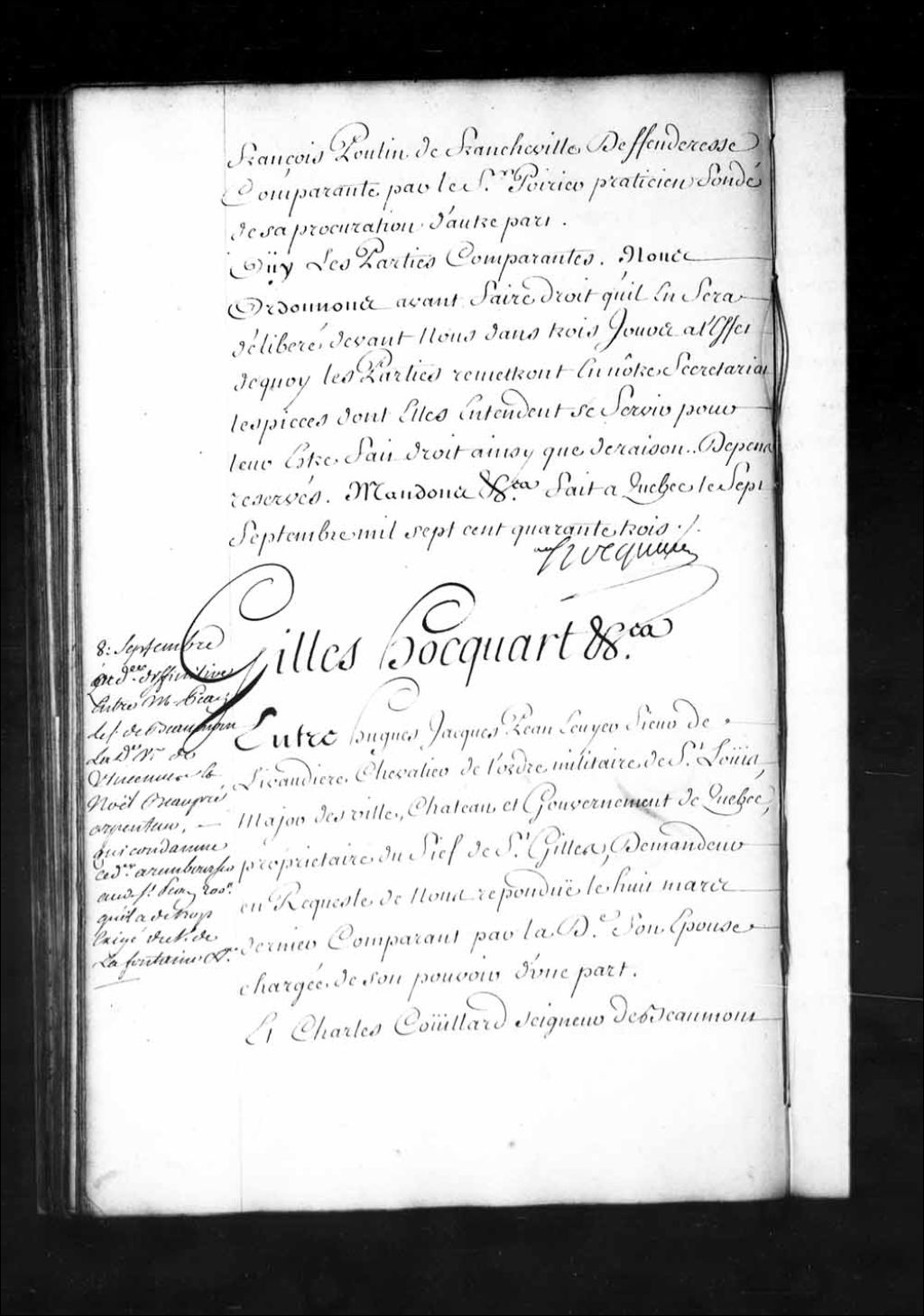 - Ordonnance définitive de l'intendant Hocquart entre Hugues-Jacques Péan de Livaudière, chevalier de Saint-Louis, major de Québec, propriétaire du fief de Saint-Gilles, Charles Couillard, seigneur de Beaumont, Marguerite Forestier, veuve de Jean Bissot de Vincennes, propriétaires du fief de Vincennes, et Noël Beaupré, arpenteur, au sujet de l'arpentage desdits fiefs de Beaumont, Vincennes et Saint-Gilles