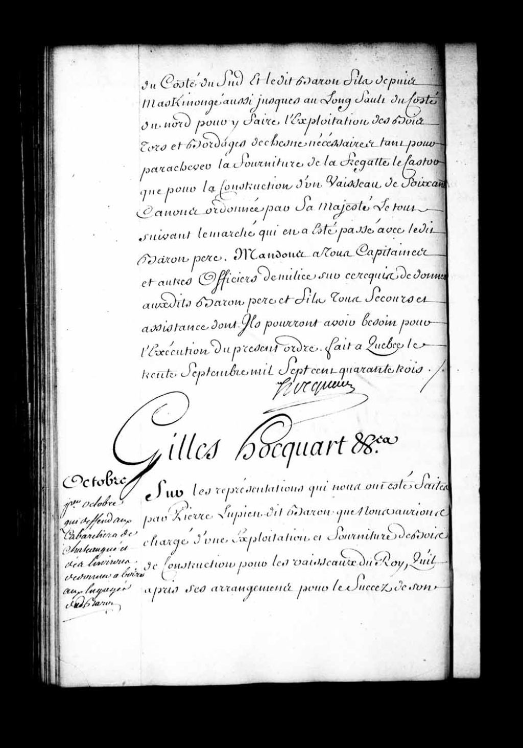 Ordonnance de l'intendant Hocquart qui défend aux cabaretiers de Châteauguay et des environs de donner à boire aux engagés de Pierre Lupien dit Baron lorsqu'ils iront les dimanches, fêtes et autres jours dans lesdites paroisses, et ce à peine contre les contrevenants de dix livres d'amende; permis cependant aux cabaretiers de donner auxdits engagés, lorsqu'ils iront dans lesdites paroisses, un coup à boire en passant lorsqu'ils en auront besoin, pourvu néanmoins que ce soit le matin desdits jours de dimanche, fêtes ou autres jours, 1er octobre 1743, Archives nationales à Québec, Fonds Intendants, (03Q,E1,S1,D31,P3540).
