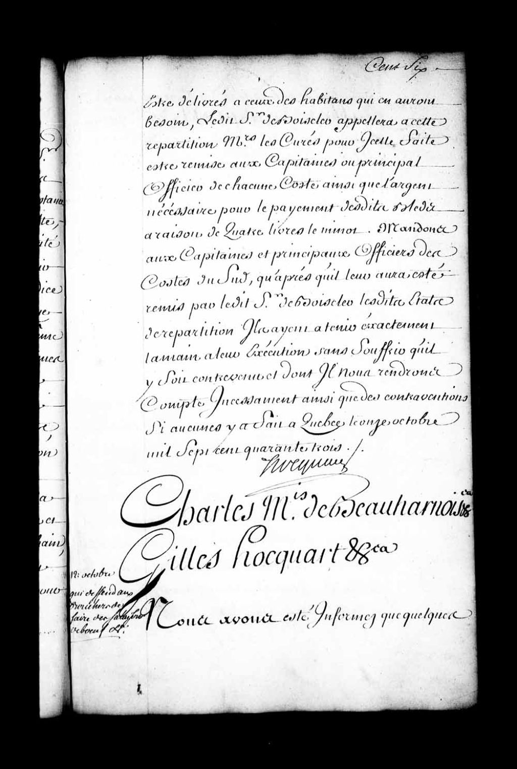 Ordonnance de l'intendant Hocquart qui, pour empêcher l'augmentation du prix de la viande de boucherie, défend aux bouchers de Québec de faire des salaisons de boeuf; pareilles défenses à ceux qui ont fait des salaisons de les vendre autrement qu'en détail et aux capitaines des vaisseaux d'en embarquer sur leur bord sans la permission de l'intendant ou des officiers de police, 12 octobre 1743, Archives nationales à Québec, Fonds Intendants, (03Q,E1,S1,D31,P3549).