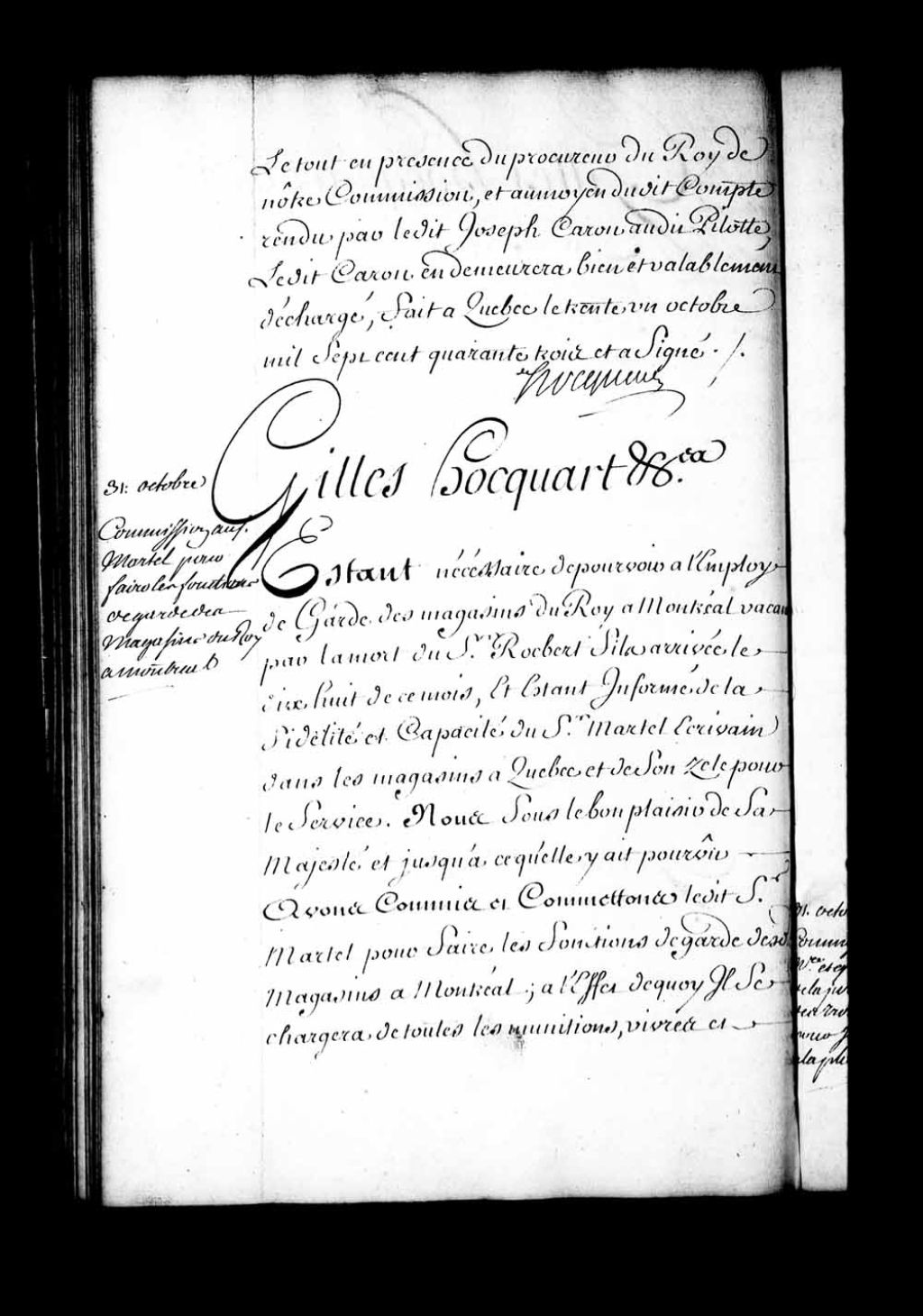 Commission de l'intendant Hocquart au sieur Martel, écrivain dans les magasins à Québec, pour faire les fonctions de garde des magasins du Roi à Montréal, vacantes par la mort du sieur Rocbert (de la Morandière) fils arrivée le 18 octobre