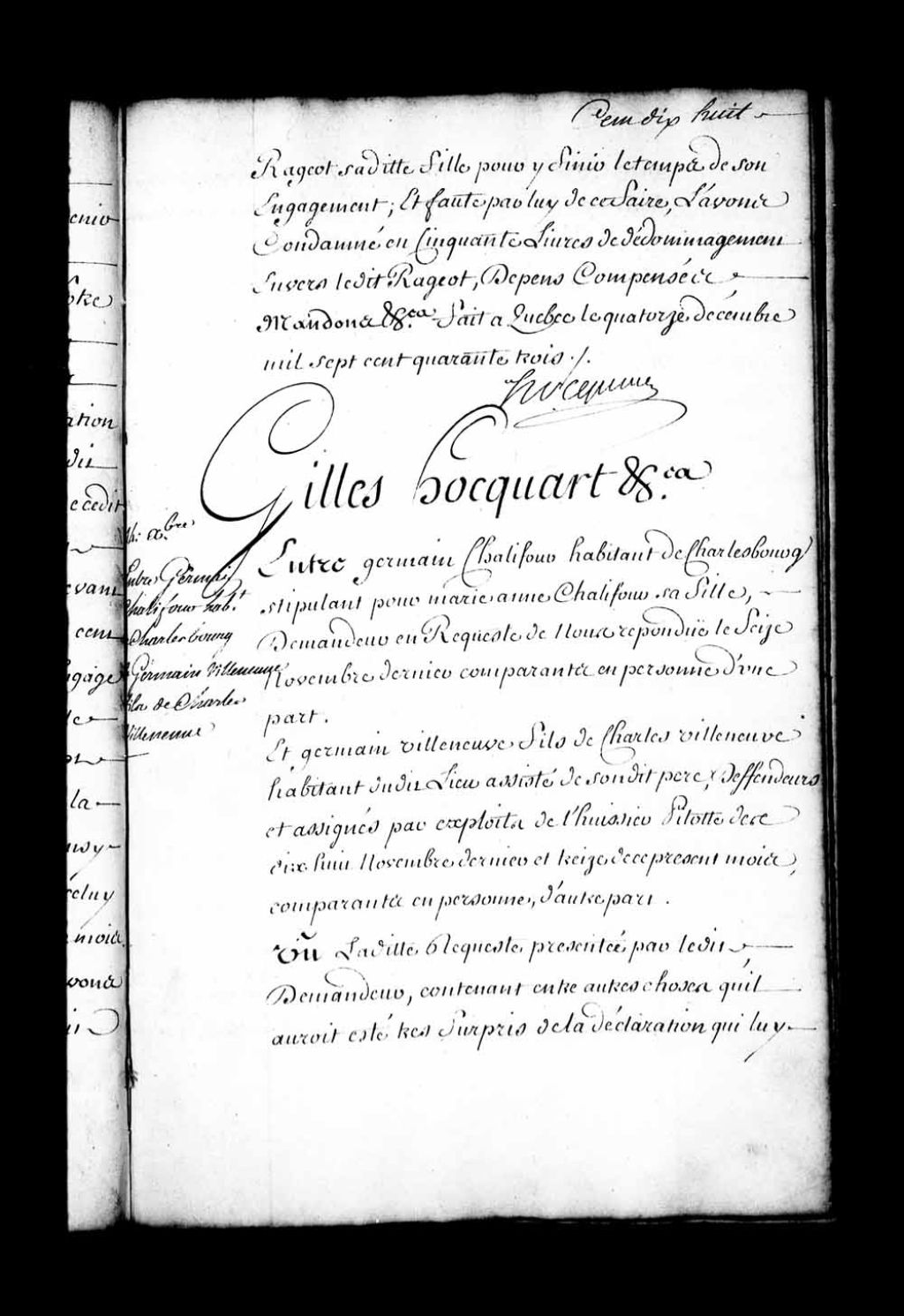 Ordonnance de l'intendant Hocquart qui condamne Germain Villeneuve, fils de Charles Villeneuve, habitant de Charlesbourg, à cent livres de dommages et intérêt envers Marie-Anne Chalifour (Chalifou, Chalifoux), à se charger de l'enfant dont elle est accouchée, d'en prendre soin et icelui faire élever dans la religion catholique, apostolique et romaine jusqu'à ce qu'il soit en état de gagner sa vie et d'être engagé, 14 décembre 1743, Archives nationales à Québec, Fonds Intendants, (03Q,E1,S1,D31,P3562).