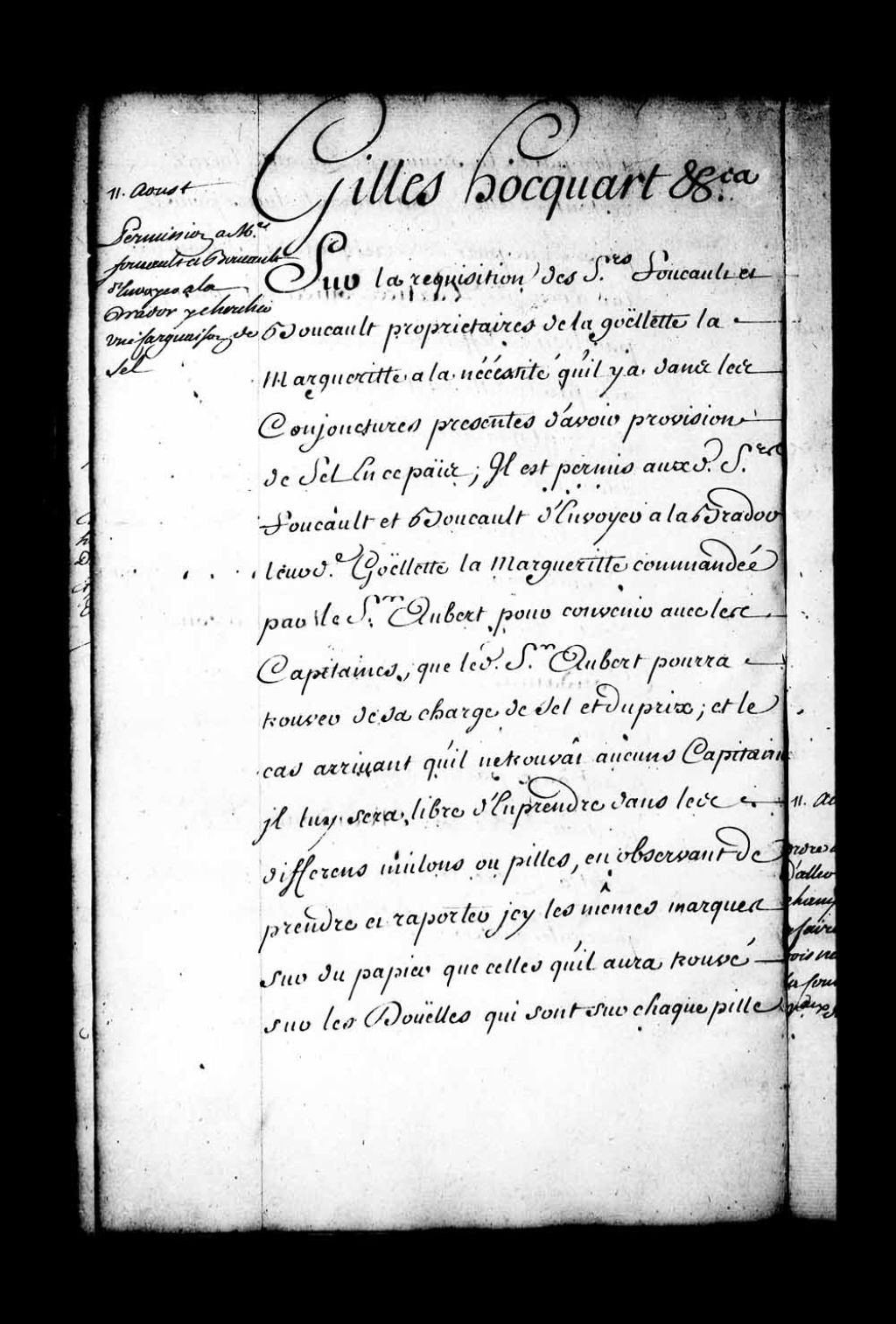 Ordonnance de l'intendant Hocquart qui permet aux sieurs Foucault et Boucault (de Godefus), propriétaires de la goélette (bateau) "la Marguerite", commandée par le sieur Aubert, de se rendre à la côte de Labrador pour en rapporter une cargaison de sel, 11 août 1744, Archives nationales à Québec, Fonds Intendants, (03Q,E1,S1,D32,P3603).
