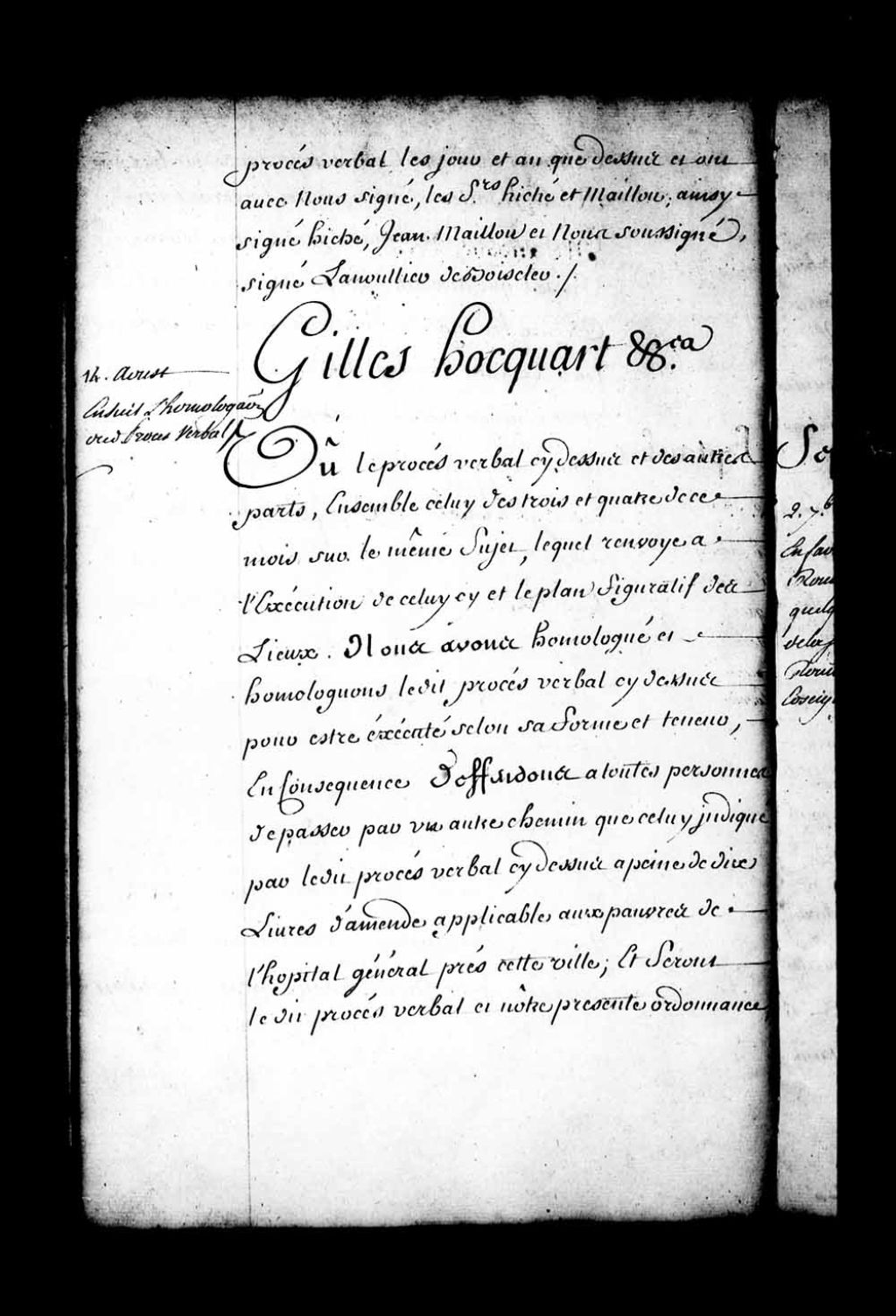 Ordonnance de l'intendant Hocquart qui homologue le procès-verbal dressé par monsieur Lanoullier (Lanouiller) de Boisclerc, grand voyer, le 31 juillet 1744, pour un chemin à faire depuis le moulin des Pères Jésuites, près le passage de la Petite-Rivière [Petite-Rivière-Saint-Charles], à aller en gagnant le chemin de la Petite-Rivière, du côté du sud, sous le coteau appelé vulgairement Sainte-Geneviève