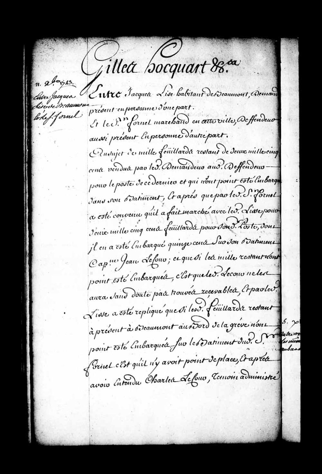 Ordonnance de l'intendant Hocquart qui surcis à faire droit sur la demande de Jacques Lise (Lisé, Lizé, Saint-Martin), habitant de Beaumont, pour le paiement de mille feuillards achetés par le sieur Fornel (Fournel) pour son poste de traite du Labrador jusqu'à près le retour de Jean Lecours, capitaine du bâtiment (bateau) "de Fornel" (Fournel), dudit poste de Labrador, 11 décembre 1744, Archives nationales à Québec, Fonds Intendants, (03Q,E1,S1,D32,P3624).