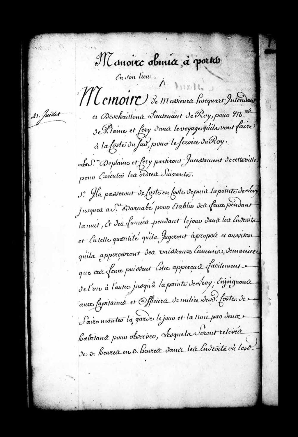 Mémoire de l'intendant Hocquart pour messieurs de Plaine (Deplaine) et Cerry (d'Ailleboust de Cerry) dans le voyage qu'ils vont faire à la côte du Sud, pour établir des feux pendant la nuit et des fumées pendant le jour, de côte en côte, depuis la Pointe-de-Lévy jusqu'à l'île Saint-Barnabé, afin de signaler les vaisseaux ennemis