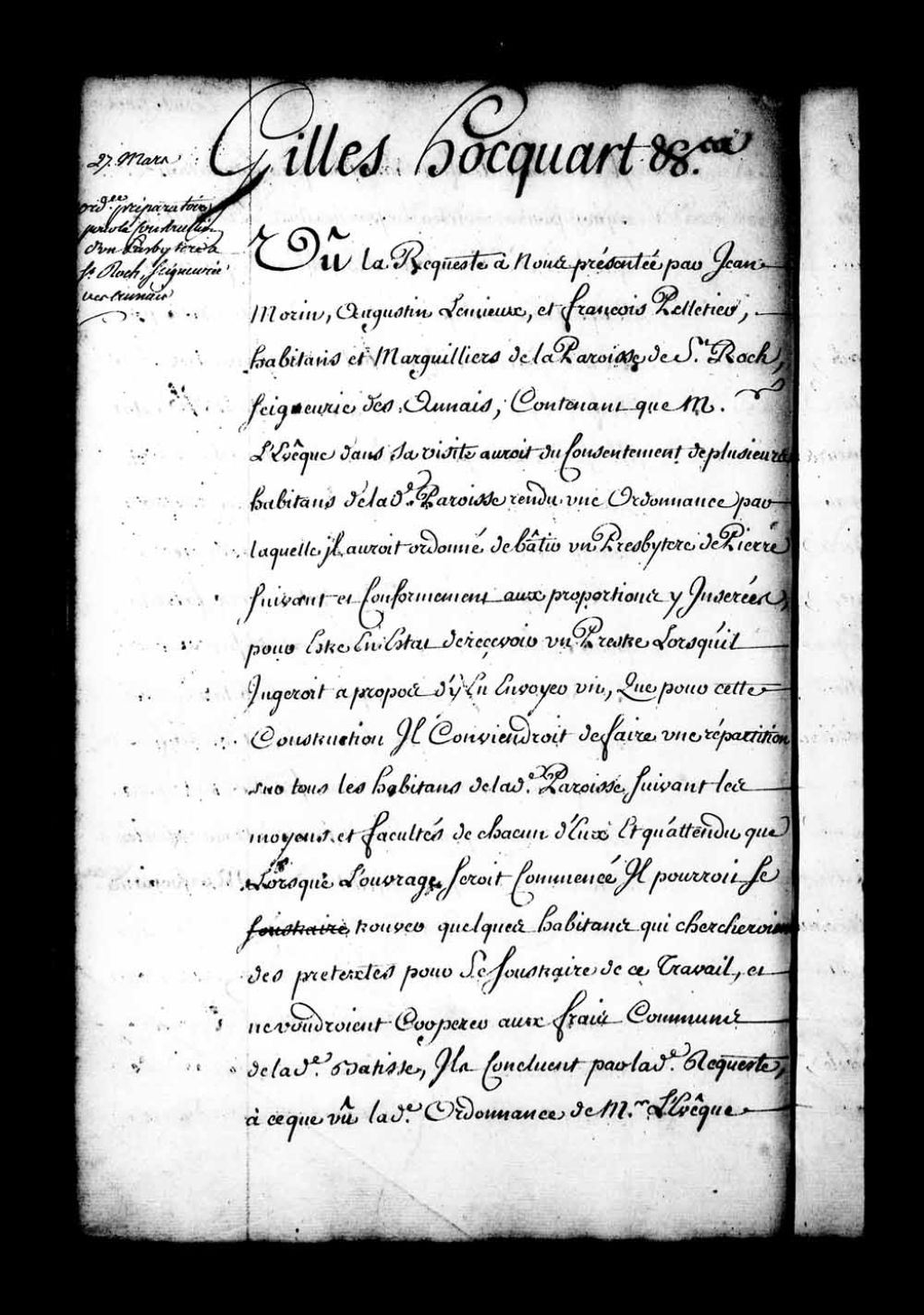 Ordonnance de l'intendant Hocquart préparatoire pour la construction d'un presbytère en pierre dans la paroisse de Saint-Roch-des-Aulnaies, 27 mars 1745, Archives nationales à Québec, Fonds Intendants, (03Q,E1,S1,D33,P3645).