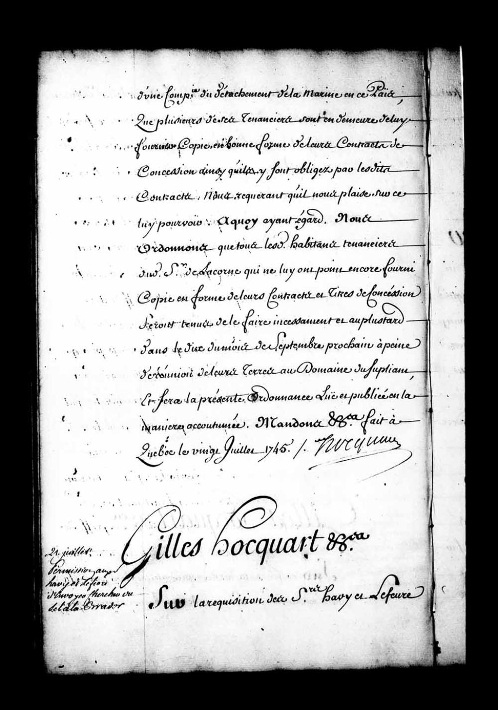 Ordonnance de l'intendant Hocquart qui permet aux sieurs Havy et Lefebvre, négociants à Québec, d'envoyer leur bateau "le Saint-Michel", capitaine Gosselin, au Labrador, au Kerpont ou autres havres des environs afin d'en rapporter une cargaison de sel, 21 juillet 1745, Archives nationales à Québec, Fonds Intendants, (03Q,E1,S1,D33,P3659).