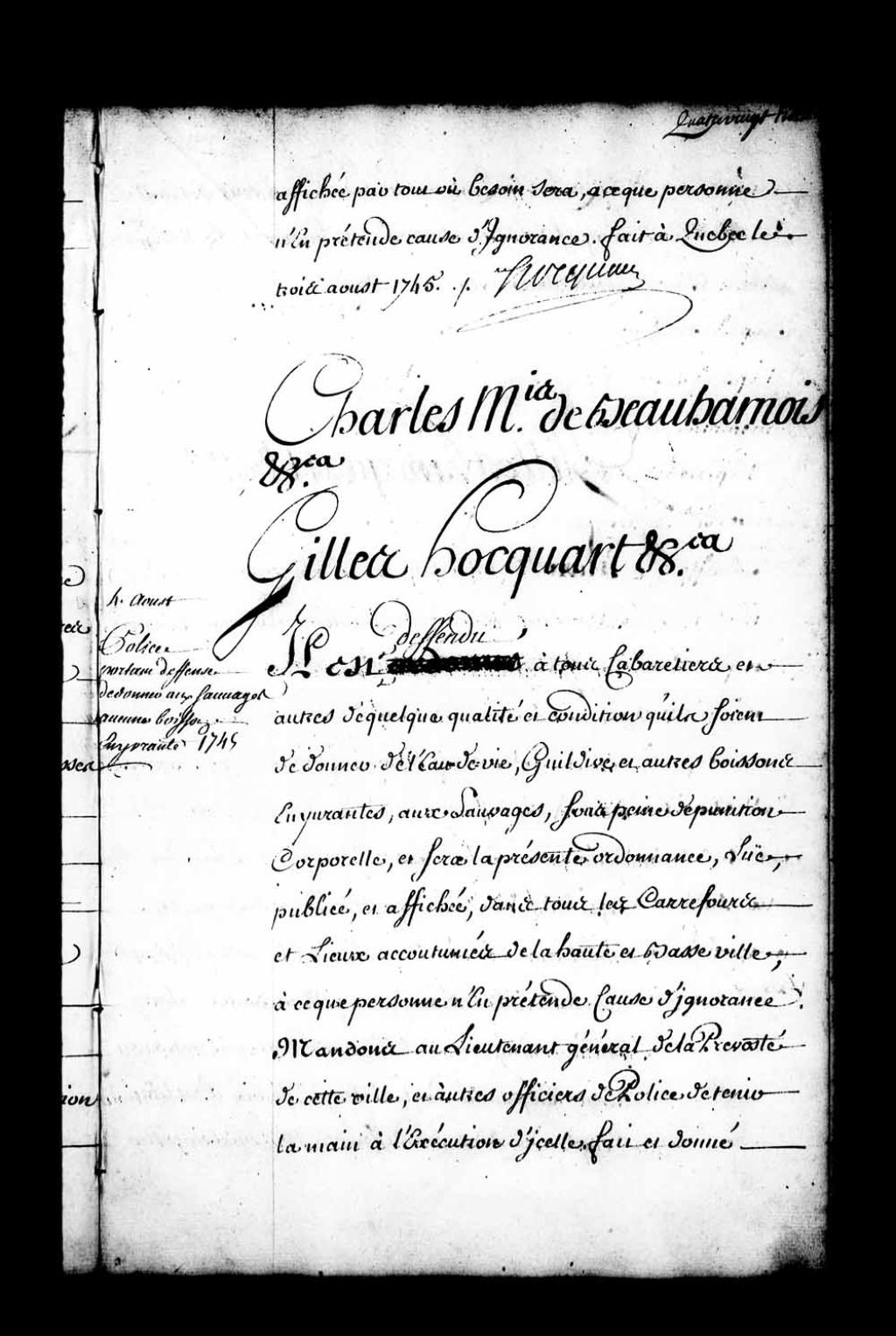 Ordonnance du gouverneur de Beauharnois et de l'intendant Hocquart qui fait défense à tous cabaretiers et autres de la ville de Québec de donner de l'eau-de-vie, guildive et autres boissons enivrantes aux Sauvages (Amérindiens) sous peine de punition corporelle, 4 août 1745, Archives nationales à Québec, Fonds Intendants, (03Q,E1,S1,D33,P3664).