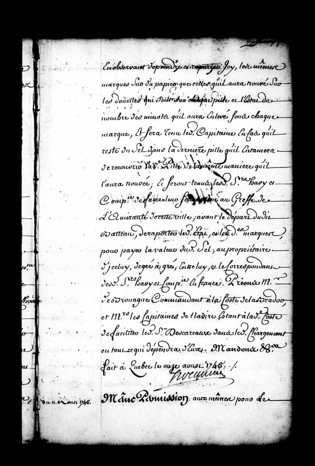 Ordonnance de l'intendant Hocquart qui permet aux sieurs Havy et Compagnie, négociants, à Québec, d'envoyer leur bateau "le Saint-Michel", capitaine Abel, à la côte du Labrador, etc., pour en rapporter une cargaison de sel, 11 août 1745, Archives nationales à Québec, Fonds Intendants, (03Q,E1,S1,D33,P3666).
