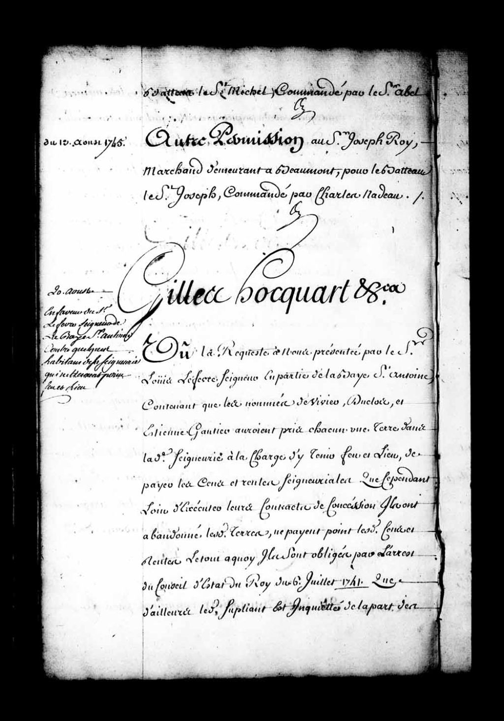 Ordonnance de l'intendant Hocquart qui permet à Joseph Roy, marchand, de Beaumont, d'envoyer son bateau "le Saint-Joseph", capitaine Charles Nadeau, à la côte du Labrador, etc., pour en rapporter une cargaison de sel