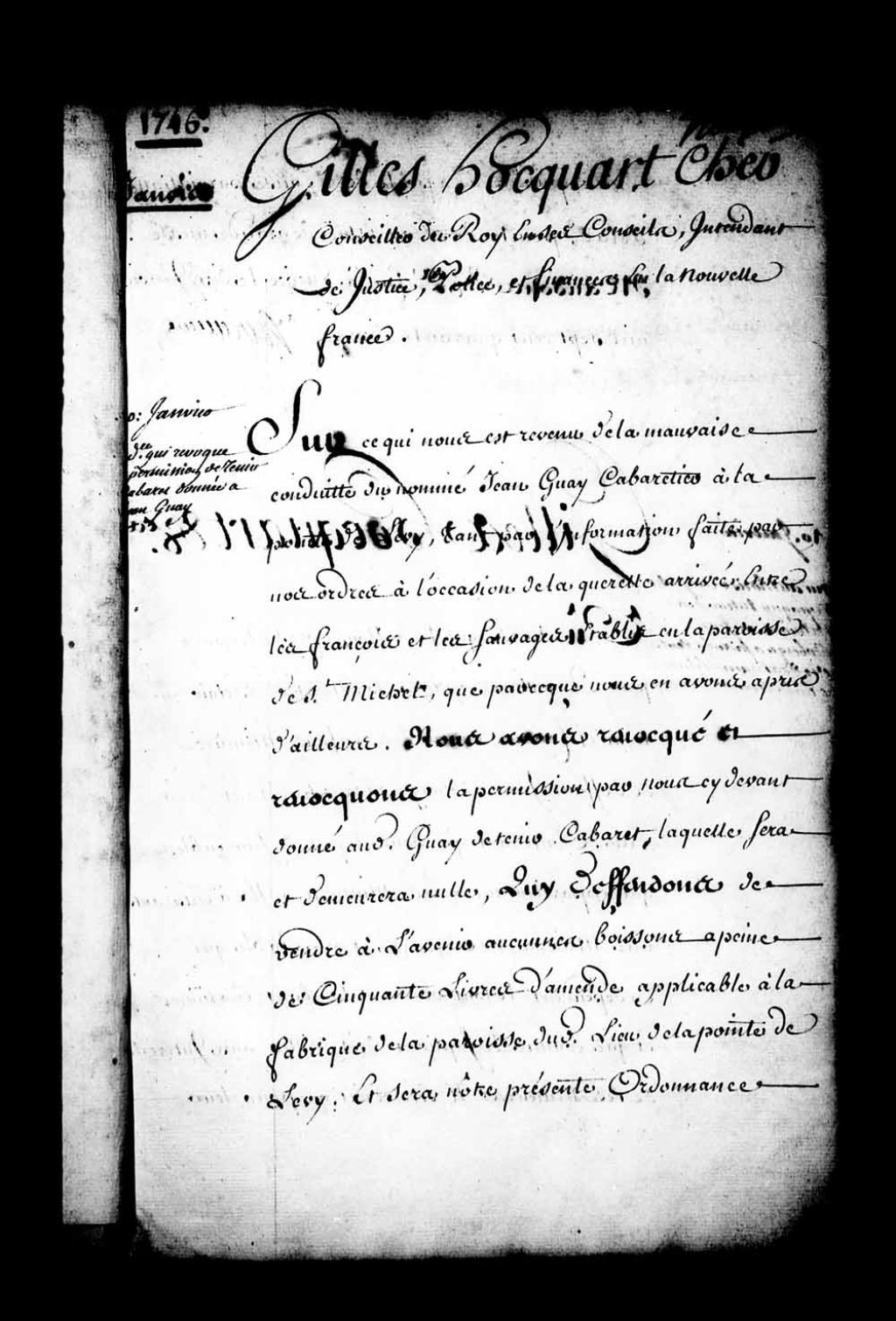 Ordonnance de l'intendant Hocquart qui porte que le testament olographe du feu sieur Plante, vivant prêtre, curé de Québec, en date du 20 février 1744, sera exécuté selon sa forme et teneur, 10 août 1745, Archives nationales à Québec, Fonds Intendants, (03Q,E1,S1,D33,P3685).