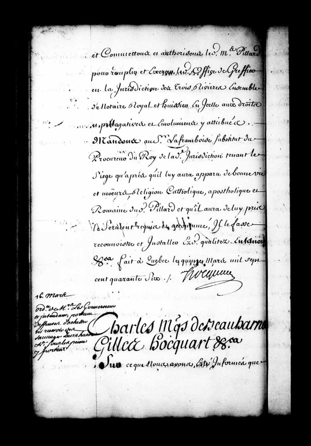 Ordonnance du gouverneur de Beauharnois et de l'intendant Hocquart qui fait défense à toutes personnes d'acheter à l'avenir ni recevoir en gages des Sauvages (Amérindiens) sous quelque prétexte que ce soit des fusils, poudre, plomb, hardes et autres effets qui peuvent leur être nécessaires pour leur usage et le service du Roi, à peine contre les contrevenants de restituer les armes et effets qu'ils auront ainsi retenus, de perdre ce qu'ils auront avancés auxdits Sauvages (Amérindiens) et en outre de cent livres d'amende pour la première fois et de plus grande peine en cas de récidive et même de punition corporelle, 16 mars 1746, Archives nationales à Québec, Fonds Intendants, (03Q,E1,S1,D34,P3697).