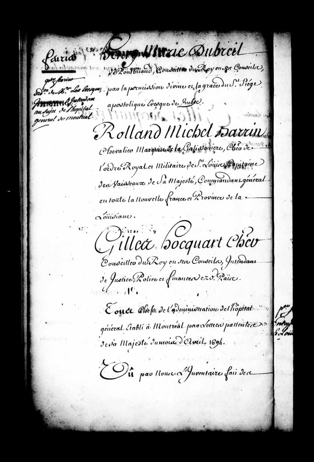 Ordonnance de l'intendant Hocquart qui porte que les effets contenus en l'inventaire des meubles et immeubles de l'Hôpital général de Montréal fait par le sieur Danré (de Blanzy), notaire, le 4 septembre 1747, seront remis à la dame d'Youville, choisie et nommée pour directrice dudit hôpital, desquels effets elle donnera reçu au pied de la minute dudit inventaire pour en rendre compte à qui et ainsi qu'il appartiendra. Cette Ordonnance de l'intendant Hocquart est signée par monseigneur de Pontbriand, évêque de Québec, le marquis de la Galissonnière, commandant général en toute la Nouvelle-France, et monsieur Hocquart, intendant de la Nouvelle-France, en leur qualité de chefs de l'administration de l'Hôpital général de Montréal, 1er février 1748, Archives nationales à Québec, Fonds Intendants, (03Q,E1,S1,D35,P3785).