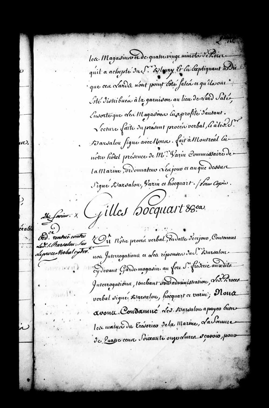 Ordonnance de l'intendant Hocquart qui condamne le sieur Barsalou, ci-devant garde-magasin au fort Saint-Frédéric, à payer entre les mains du trésorier de la Marine la somme de quatre cent soixante-onze livres, pour des marchandises que ledit Barsalou a tirées des magasins du Roi audit fort lors de son départ au mois de décembre dernier et qu'il s'est indûment approprié, et en outre, par provision, la somme de deux mille livres pour le prix des ventes faites au comptant par ledit Barsalou pendant le temps de son administration, et encore à payer la somme de quatre mille livres auxquels paiements ledit Barsalou sera contraint par corps, 24 février 1748, Archives nationales à Québec, Fonds Intendants, (03Q,E1,S1,D35,P3793).