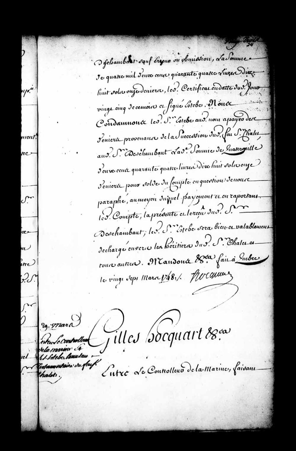 Ordonnance de l'intendant Hocquart qui condamne le sieur Estèbe, au nom de chargé de la succession du feu sieur Chalet, à payer entre les mains du trésorier de la Marine en ce pays la somme de quatorze mille deux cent quatre-vingt-dix livres un denier due au Roi par ledit feu sieur Chalet pour munitions, marchandises, poudre à canon, billets, certificats, etc, 29 mars 1748, Archives nationales à Québec, Fonds Intendants, (03Q,E1,S1,D35,P3799).