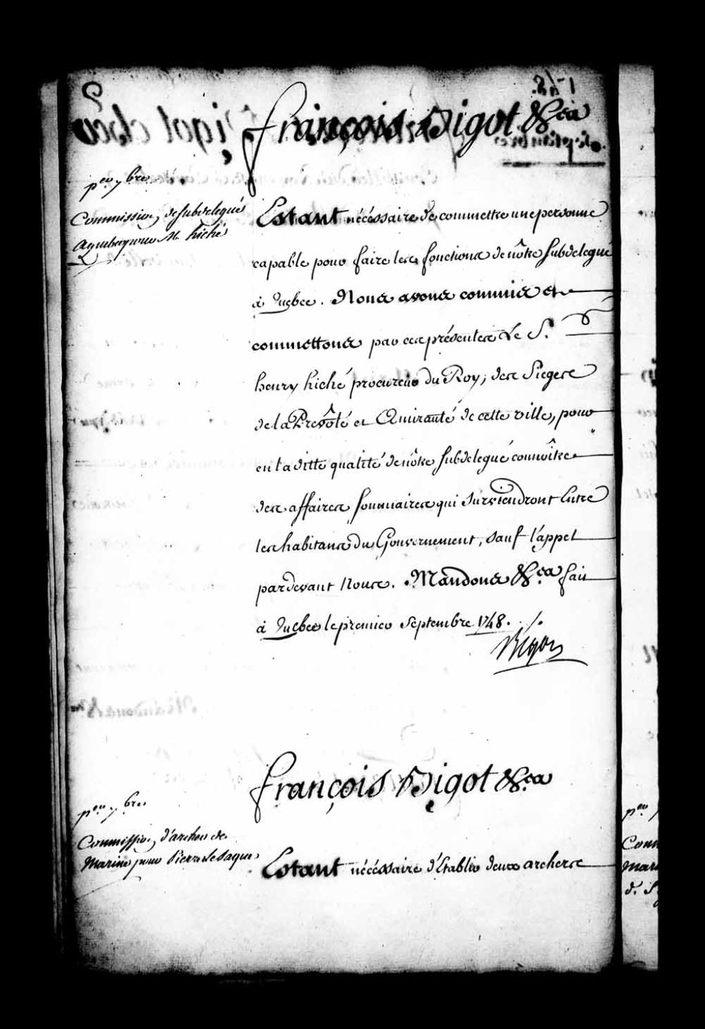 Commission d'archer de Marine à Pierre Lesaque, ci-devant archer de Marine à l'île Royale, par l'intendant Bigot pour servir près l'intendant en ladite qualité, exécuter et porter ses ordres partout et ainsi qu'il appartiendra, 1er septembre 1748, Archives nationales à Québec, Fonds Intendants, (03Q,E1,S1,D36,P3829).