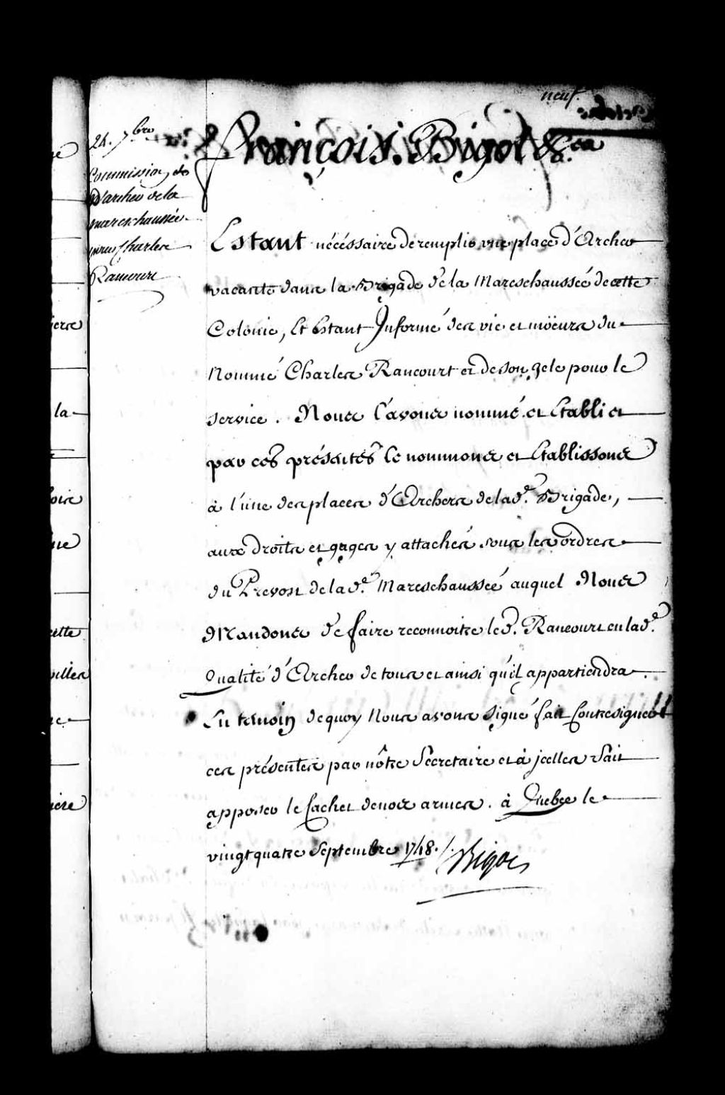 Commission d'archer de la brigade de la colonie par l'intendant Bigot pour Charles Rancourt (Rancour)