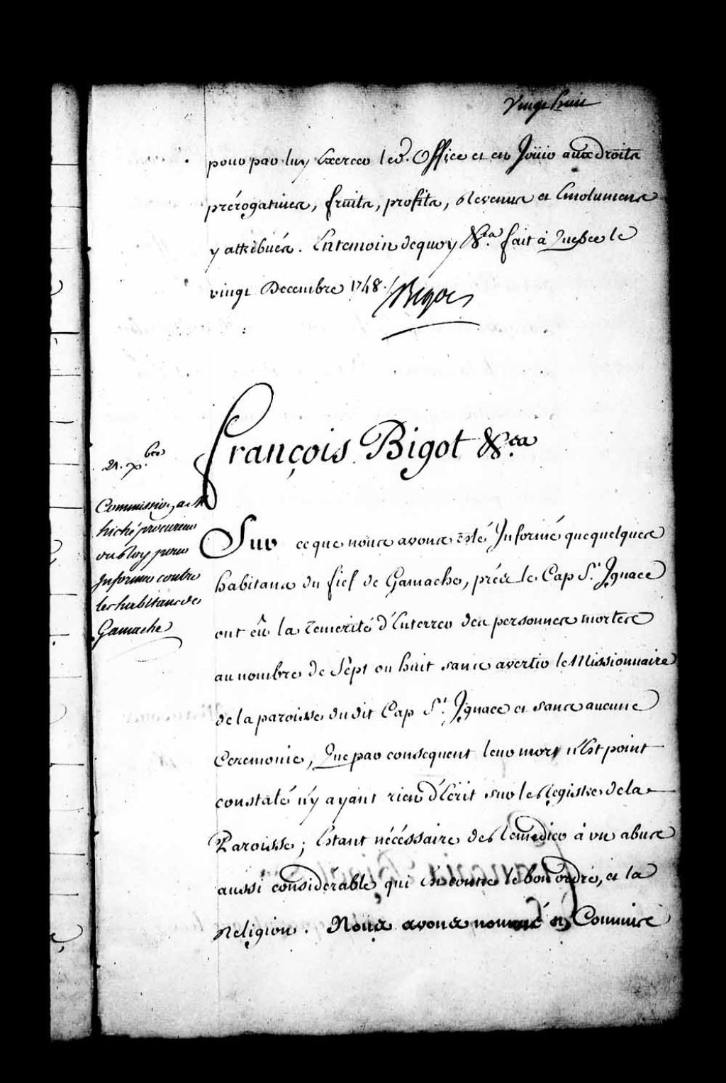 Ordonnance de l'intendant Bigot qui commet Henri Hiché, procureur du Roi de la Prévôté de Québec et subdélégué de l'intendant, pour se transporter incessamment accompagné du sieur Louet, greffier de la commission, et d'un huissier, en la paroisse du Cap-Saint-Ignace, au fief de Gamache, pour informer contre les habitants qui ont eu la témérité d'enterrer des personnes mortes au nombre de sept ou huit sans avertir le missionnaire de la paroisse du Cap-Saint-Ignace et sans aucune cérémonie, 21 décembre 1748, Archives nationales à Québec, Fonds Intendants, (03Q,E1,S1,D36,P3852).