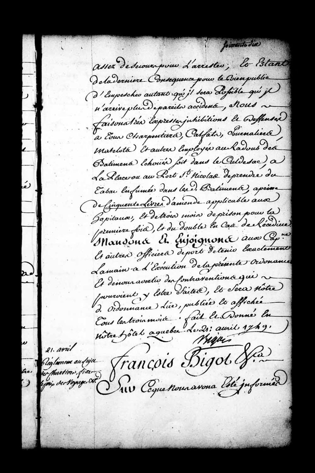 - Règlement de l'intendant Bigot qui fixe le nombre des charretiers à Québec, approuve la nomination de Martial Vallet (Valet) comme leur syndic, établit des règles pour leur gouverne, et leur donne le tarif qu'ils auront le droit de réclamer pour leurs courses et le transport des effets qu'ils feront
