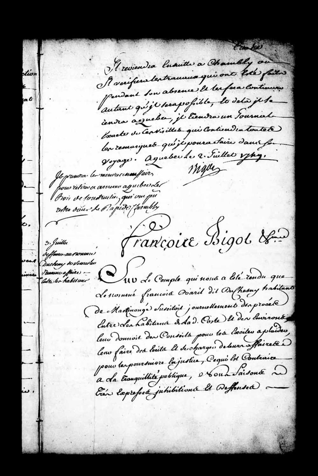 Ordonnance de l'intendant Bigot qui fait très expresses défenses à François Baril dit Duchesny (Ducheny), habitant de Maskinongé, de se mêler à l'avenir d'aucunes affaires entre qui que ce soit, de donner des conseils à personne, de faire des écrits, ni de poursuivre aucun procès en justice, à moins que ce ne soit pour ses affaires particulières; s'il contrevient aux présentes défenses il devra sortir de la colonie attendu qu'il interrompt la tranquillité publique, 3 juillet 1749, Archives nationales à Québec, Fonds Intendants, (03Q,E1,S1,D36,P3917).