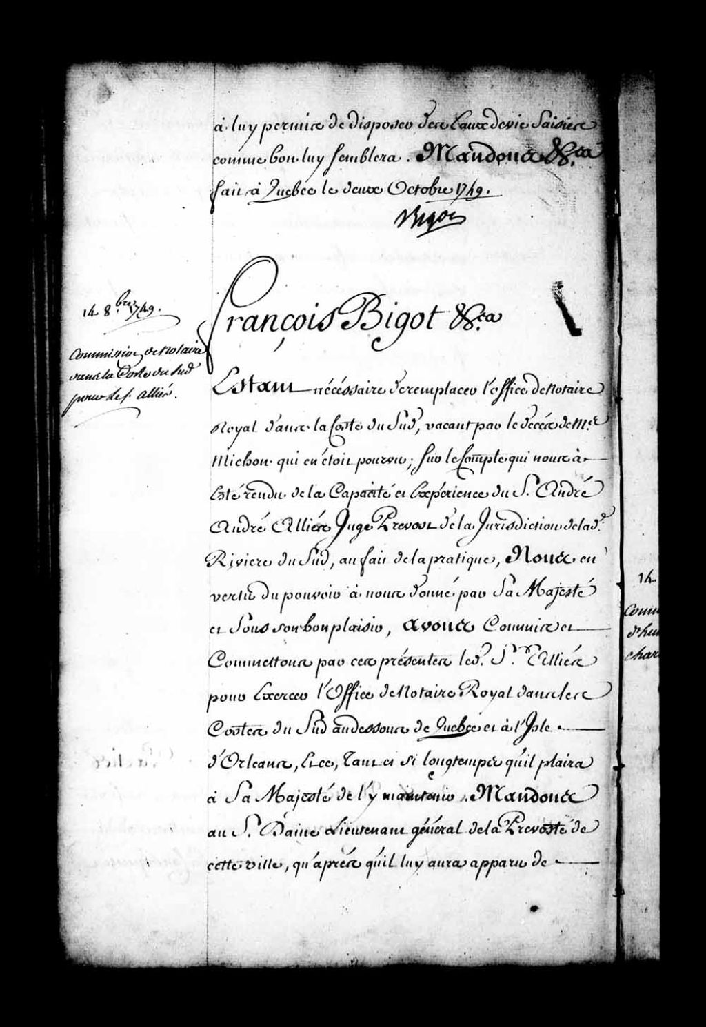 Commission de notaire royal dans les côtes du sud au-dessous de Québec et à l'île d'Orléans par l'intendant Bigot pour André Alliés (Allier), juge prévôt de la Juridiction de la Rivière-du-Sud, en remplacement du sieur Michon, décédé, 14 octobre 1749, Archives nationales à Québec, Fonds Intendants, (03Q,E1,S1,D36,P3927).