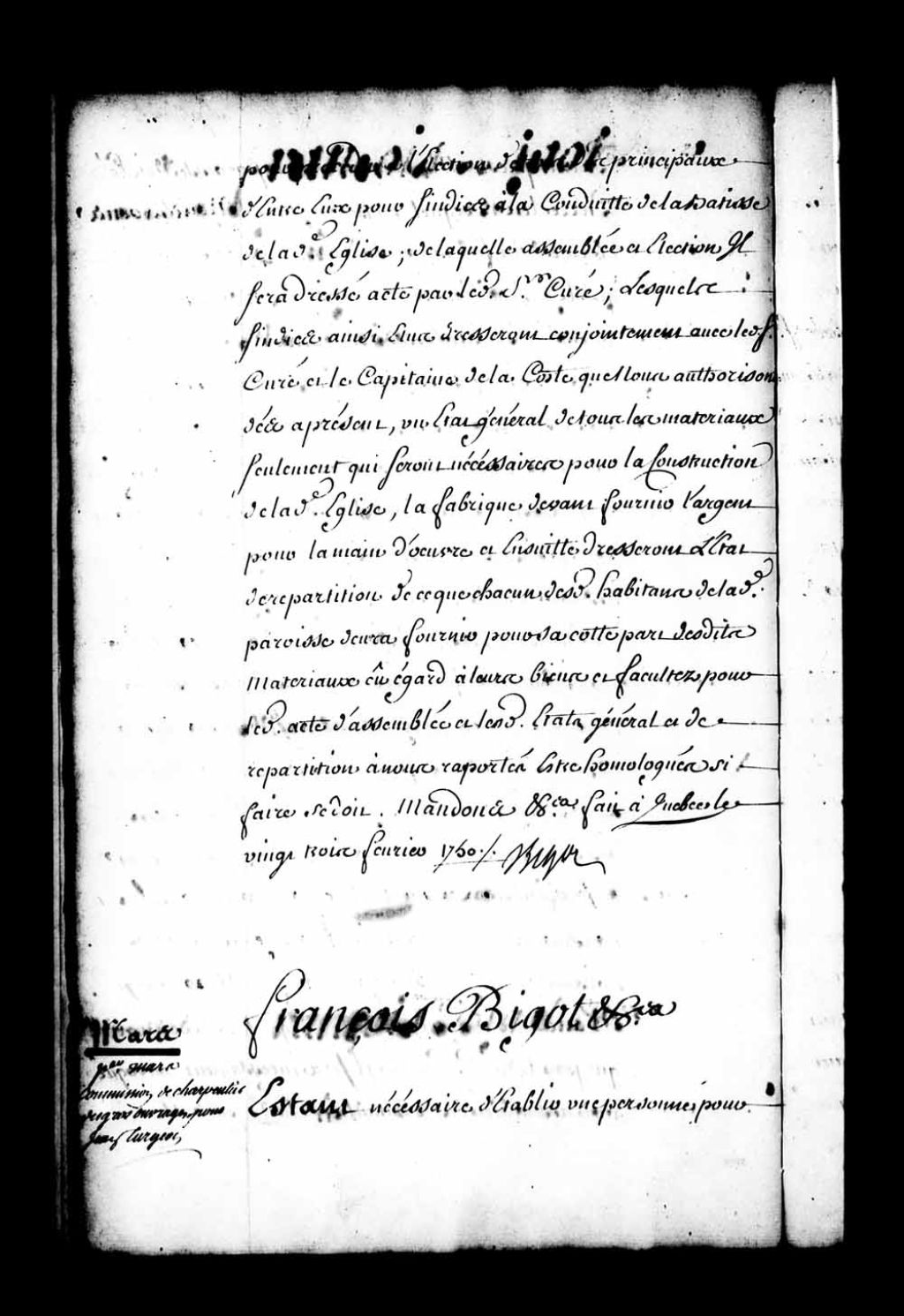 Commission de charpentier du Roi à Québec par l'intendant Bigot, pour Jean Turgeon fils, en remplacement de Jean Turgeon père, décédé, pour en ladite qualité faire dorénavant les potences, carcans, échafauds et autres bois de charpente nécessaires aux exécutions des criminels et planter lesdites potences, carcans, échafauds et autres bois nécessaires, aux gages de cent dix livres par an, etc