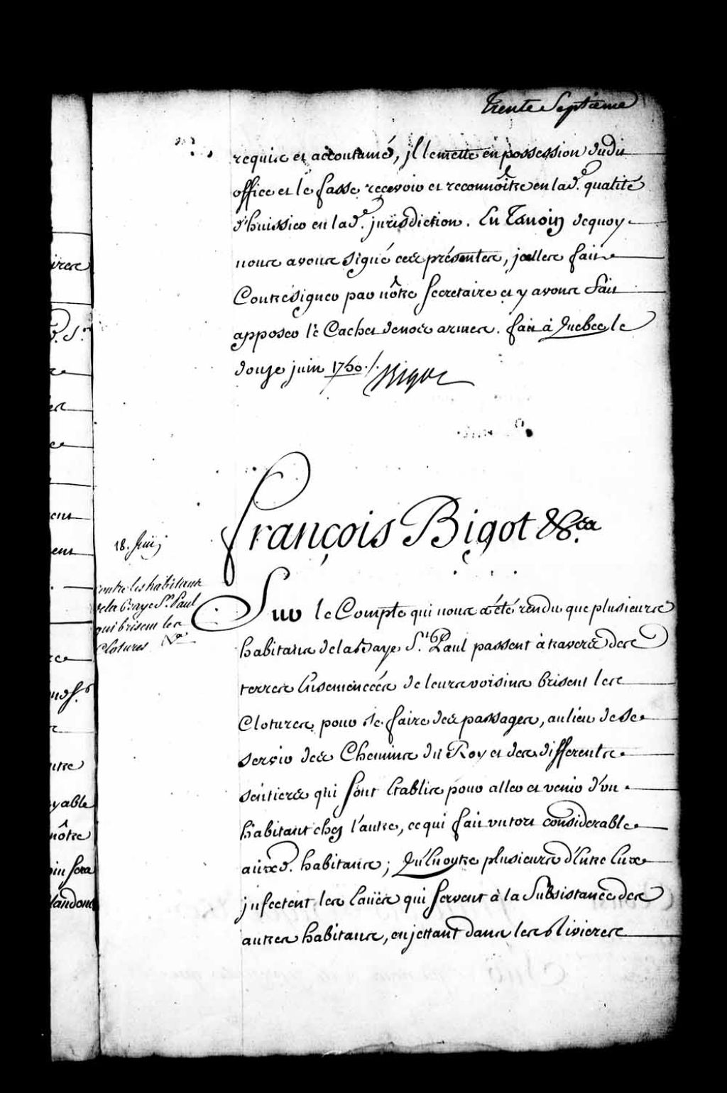 Ordonnance de l'intendant Bigot qui fait défense à tous chirurgiens de vaisseaux venant de France ou d'ailleurs, ensemble à tous chirurgiens étrangers de quelques nations qu'ils soient, autres que ceux qui sont établis dans les villes de ce pays et dans les côtes, de panser et médicamenter les malades de ce pays, sans au préalable avoir subi un sérieux examen sur l'art de la chirurgie, à peine contre les contrevenants de deux cents livres d'amende et de confiscation des instruments et remèdes dont ils se trouveront saisis; ceux de cette profession qui voudront l'exercer ici seront tenus de subir un examen sérieux par-devant le médecin du Roi à Québec, présence du lieutenant général de la Prévôté de cette ville; il en sera de même pour ceux qui voudront exercer ladite profession soit dans les villes de Montréal et Trois-Rivières ou dans les gouvernements de ces villes, etc