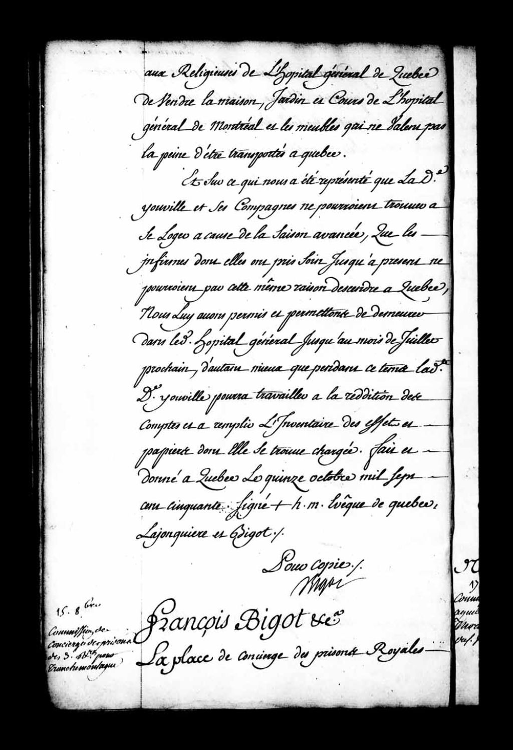 Commission de concierge des prisons de la ville des Trois-Rivières par l'intendant Bigot pour François Thomas dit Tranchemontagne, à la place de Philippe Vinet, qui a donné sa démission de ladite charge, 15 octobre 1750, Archives nationales à Québec, Fonds Intendants, (03Q,E1,S1,D38,P4001).
