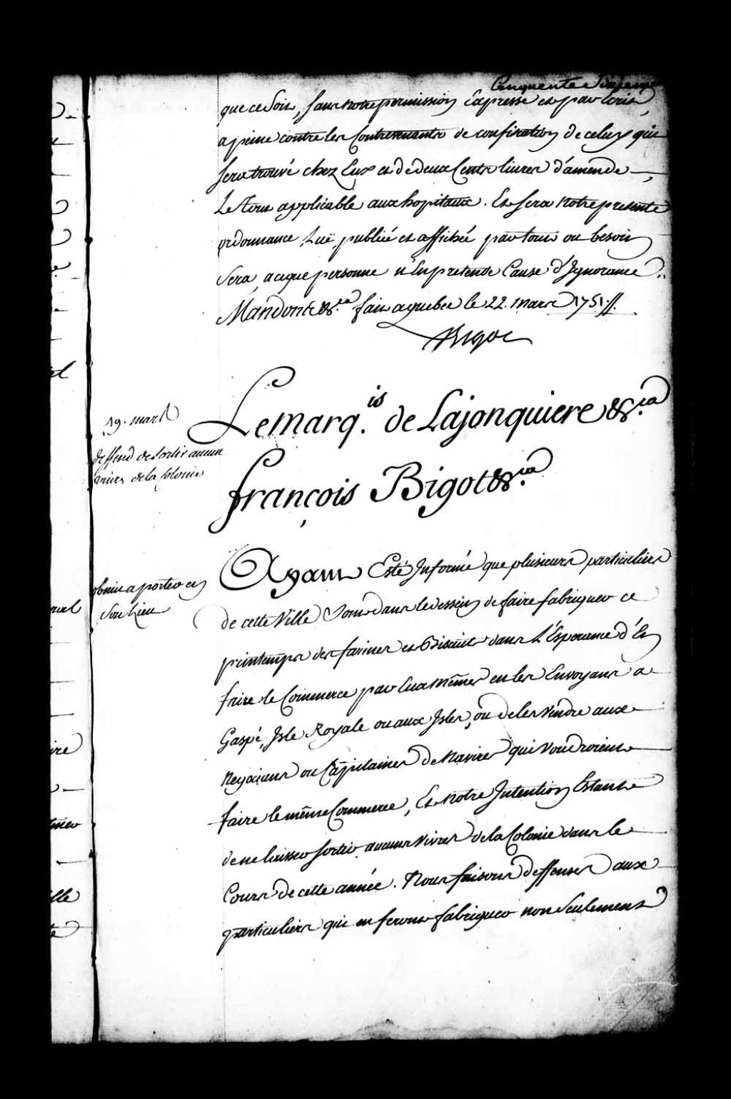 Ordonnance du gouverneur de la Jonquière et de l'intendant Bigot qui fait défense aux particuliers de la ville de Québec qui sont dans le dessein de faire fabriquer ce printemps des farines et biscuits non seulement de les faire sortir de la colonie mais encore de les vendre aux particuliers qui voudraient les expédier à Gaspé, île Royale ou aux Îles; enjoint auxdits particuliers de vendre leurs farines et biscuits soit aux boulangers de Québec ou aux domiciliés pour leur subsistance à peine contre le vendeur desdits vivres de cinq cents livres d'amende au profit des pauvres et de six mois de prison et aussi à peine contre l'acheteur de confiscation desdits vivres, applicable aux pauvres et de pareille amende de cinq cents livres et aussi de six mois de prison, 19 mars 1751, Archives nationales à Québec, Fonds Intendants, (03Q,E1,S1,D38,P4019).