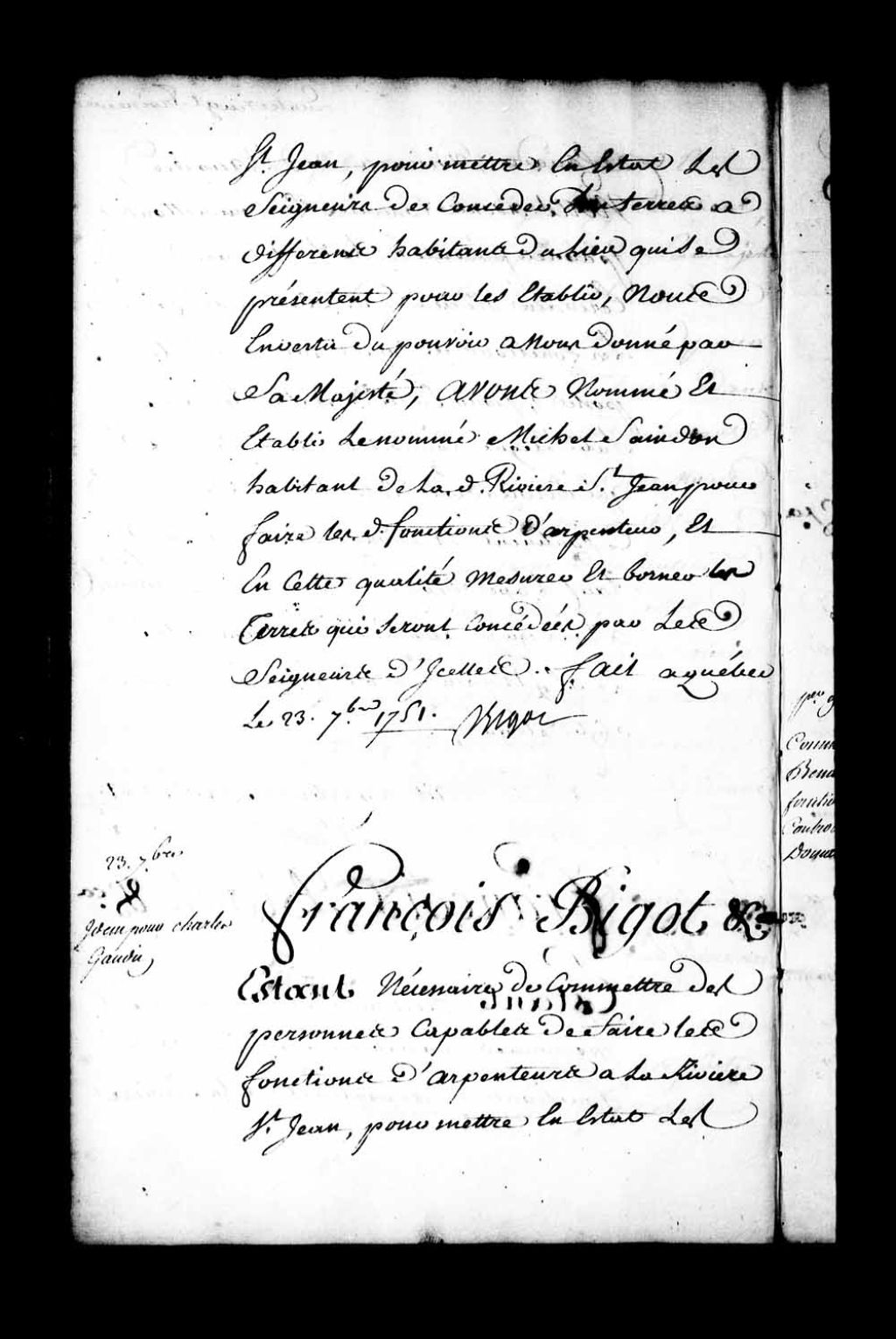 Commission d'arpenteur à la rivière Saint-Jean par l'intendant Bigot pour le nommé Charles Gaudin (Godin), pour en ladite qualité mettre en état les seigneurs de concéder des terres à différents habitants du lieu qui se présentent pour les établir