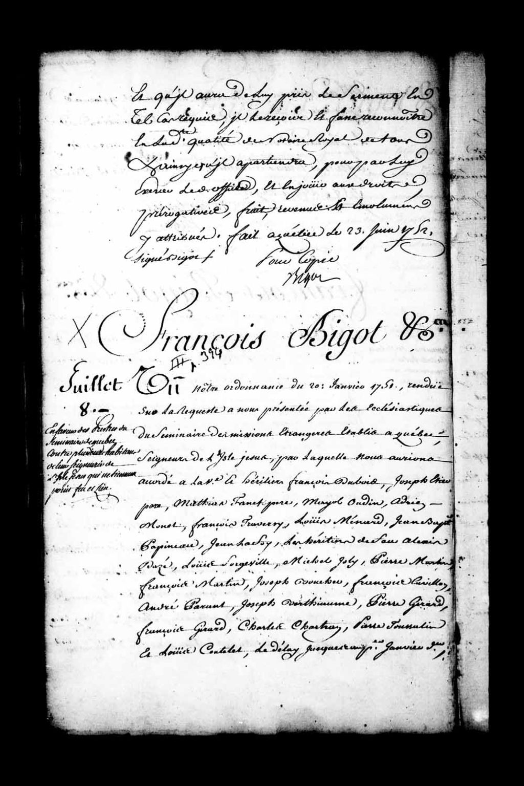 Ordonnance de l'intendant Bigot qui, en exécution de l'arrêt du Conseil d’État du 6 juillet 1711, déclare Adrien Monet, François Traversy, Louis Ménard, Jean-Baptiste Lafoy, les héritiers de feu Alexis Dazé, Louis Sorgeville, Michel Joly, Pierre Martin, Joseph Boucher, François Cuvillon (Quévillon), Jean-Baptiste Papineau, André Parant (Parent), Joseph Berthiaume, Jean Girard, François Girard, Charles Chartran (Chartrand), Pierre Toussalin, Joseph Chartran et Louis Coutalet (Coutelet), tous de la paroisse Saint-Vincent-de-Paul, et Mathias Faneuf (Phaneuf) et la veuve François Dubois, de Sainte-Rose, déchus de la propriété de leurs terres faute d'y avoir tenu feu et lieu, et réunit lesdites terres au domaine des messieurs du séminaire de Québec, seigneurs de l'île Jésus