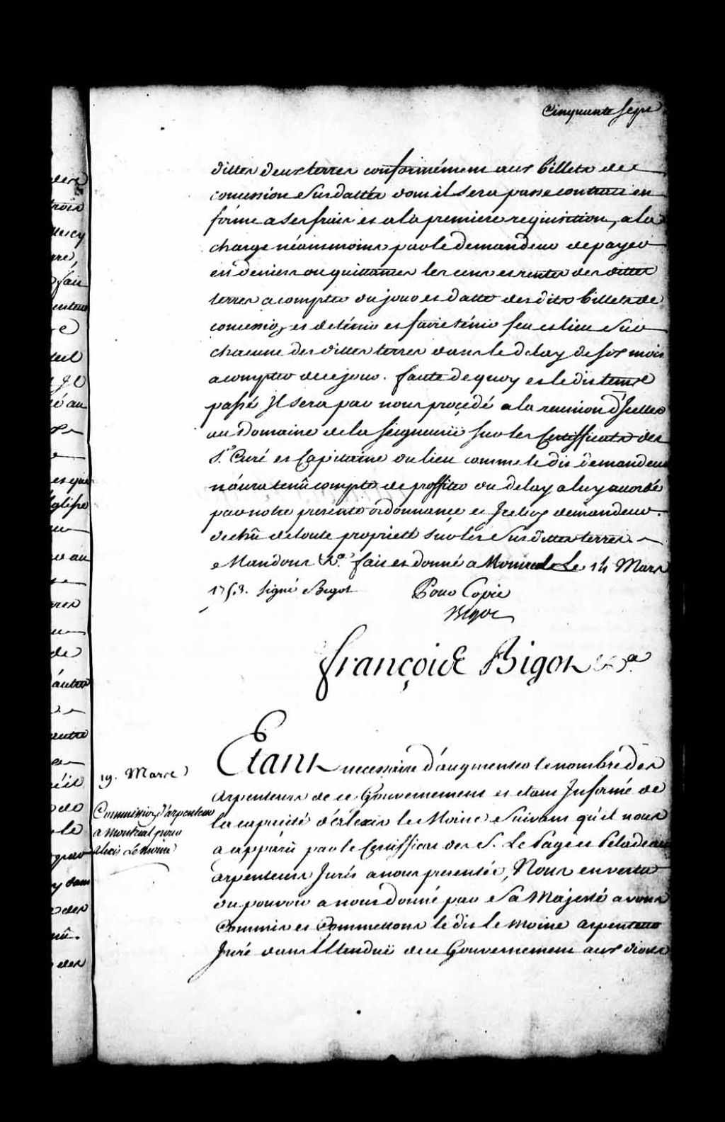 Commission d'arpenteur dans l'étendue du gouvernement de Montréal par l'intendant Bigot pour Alexis Lemoine (Lemoyne), 19 mars 1753, Archives nationales à Québec, Fonds Intendants, (03Q,E1,S1,D40,P4124).