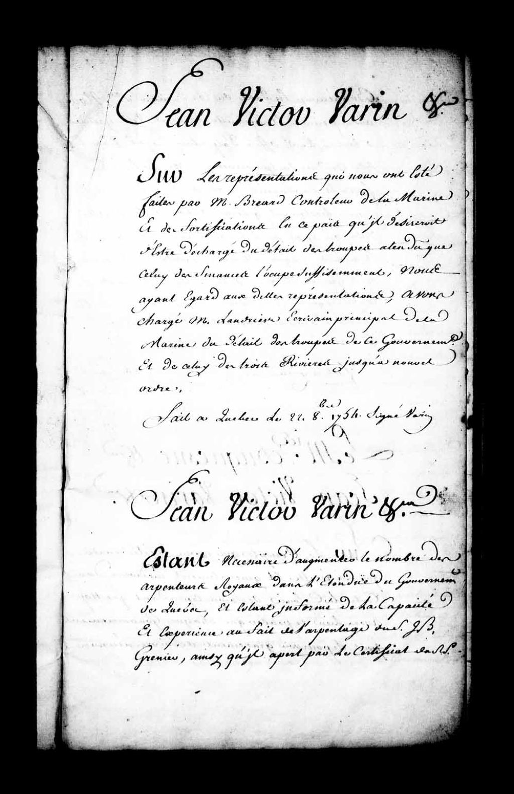 Commission d'arpenteur dans le gouvernement de Québec par Jean-Victor Varin de La Marre (Lamarre), faisant les fonctions d'intendant, pour Jean-Baptiste Grenier