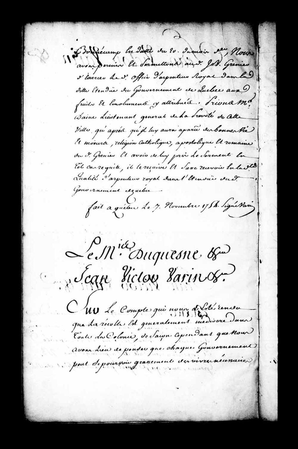 Ordonnance du gouverneur de Duquesne et de Jean-Victor Varin de La Marre, faisant les fonctions d'intendant, qui, à cause de la récolte médiocre et afin de prévenir la disette dans la colonie, fait défense à tous particuliers qui auraient dessein de faire fabriquer des farines ou biscuits ou de faire des achats de légumes, non seulement de les faire sortir pour leur compte l'année prochaine mais encore de les vendre à d'autres particuliers ou capitaines de navires qui seront dans le cas d'en faire le commerce, à peine contre les vendeurs des dits vivres de cinq cents livres d'amende au profit des pauvres et de six mois de prison, et aussi à peine contre les acheteurs de confiscation des dits vivres, de pareille amende et aussi de six mois de prison; pareilles défenses aux voituriers et maîtres de barques de charger farines, blés, poix, lards et autres vivres, dans le gouvernement de Montréal pour celui de Québec, sans une permission écrite sous les mêmes peines