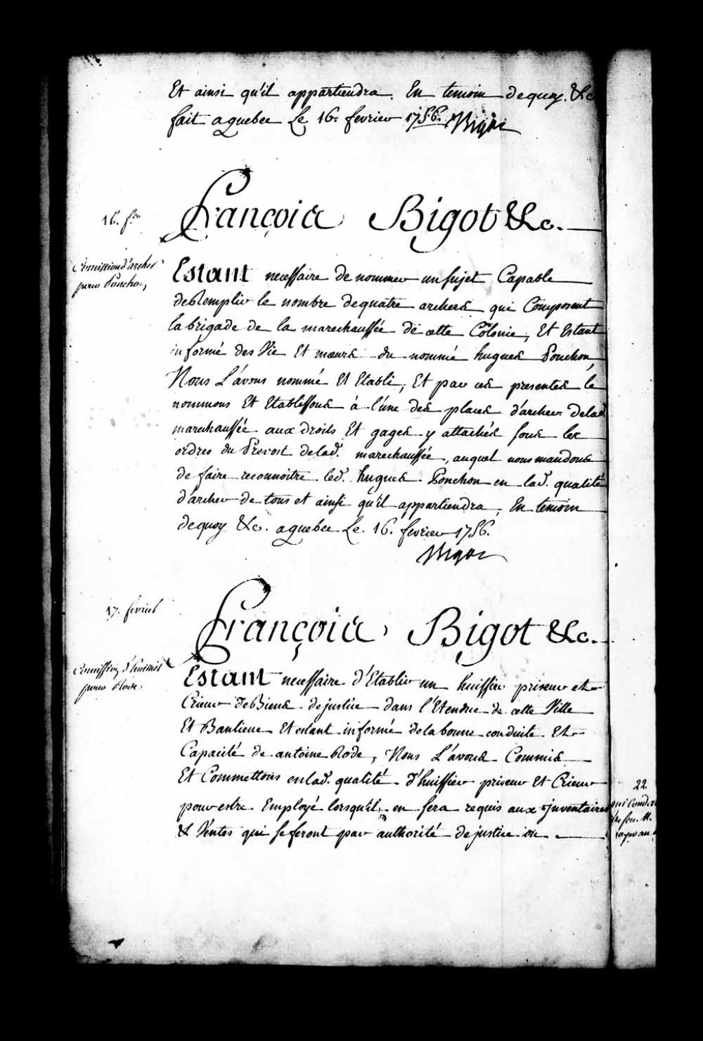 Commission d'archer de la Maréchaussée de la colonie par l'intendant Bigot à Hugues Ponchon