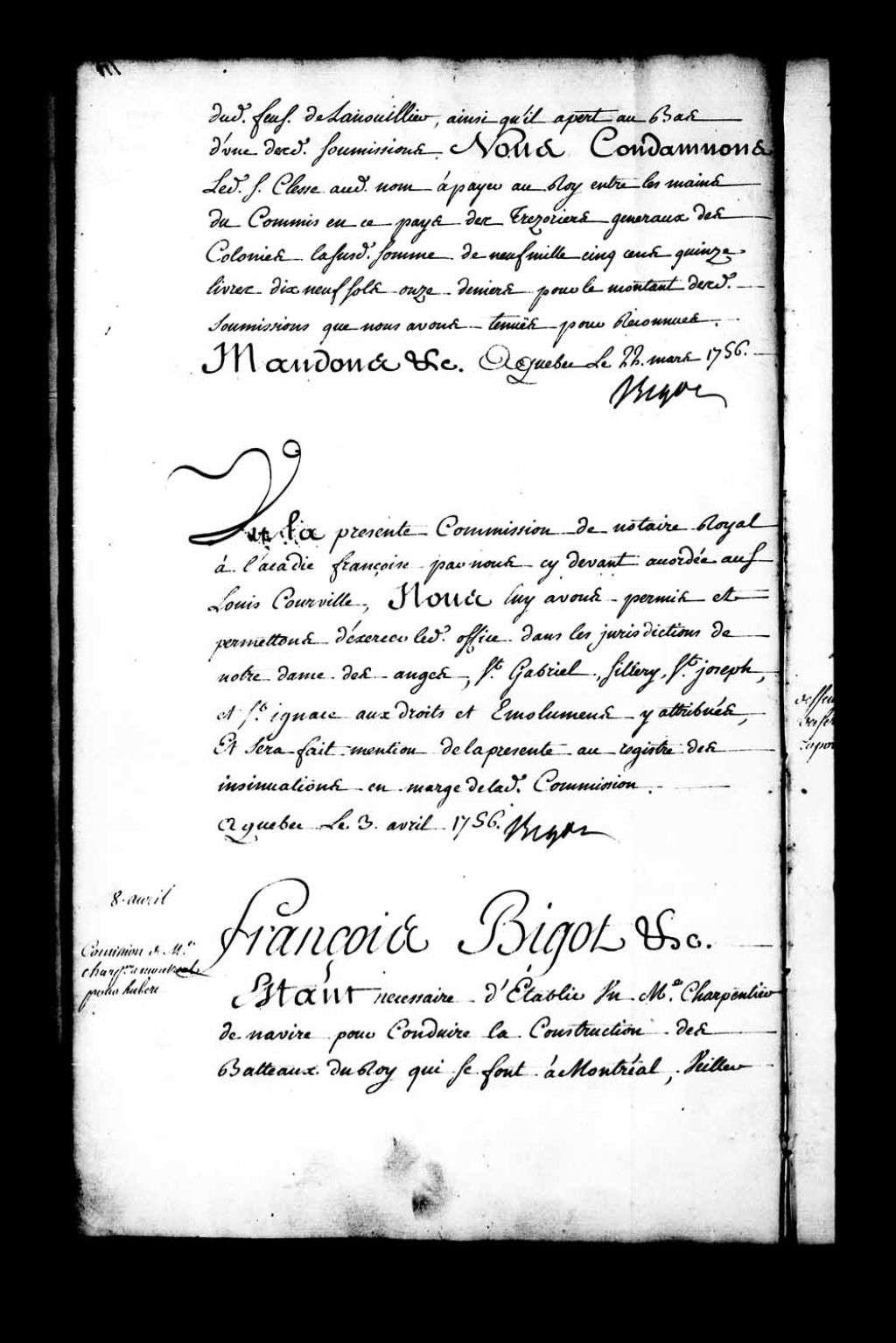 Commission de maître charpentier du Roi à Montréal par l'intendant Bigot pour Pierre Hubert, charpentier employé au port de Québec à la construction des vaisseaux du Roi, pour en ladite qualité conduire la construction des bateaux du Roi qui se font à Montréal, veiller à la conservation et à l'emploi des bois, brai, étoupe et autres ustensiles nécessaires à leur construction, 8 avril 1756, Archives nationales à Québec, Fonds Intendants, (03Q,E1,S1,D42,P4219).