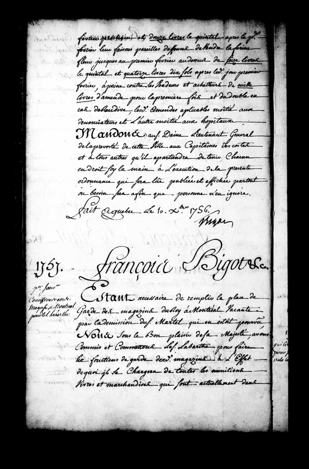 Commission de garde des magasins du Roi à Montréal par l'intendant Bigot pour le sieur La Barthe (de Labarthe), à la place du sieur Martel qui a donné sa démission dudit office, 1er janvier 1757, Archives nationales à Québec, Fonds Intendants, (03Q,E1,S1,D42,P4243).