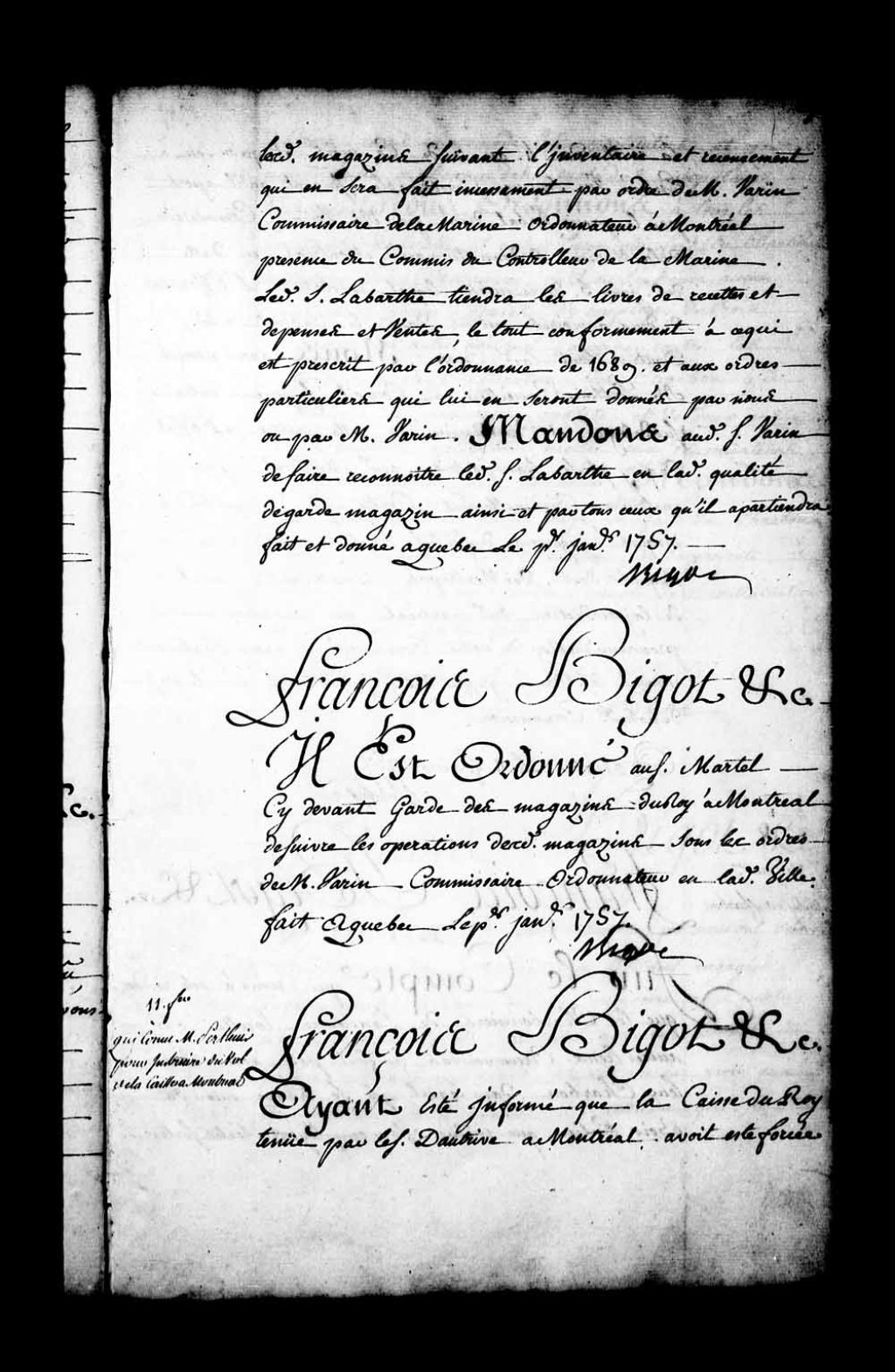 Ordre par l'intendant Bigot au sieur Martel, ci-devant garde des magasins du Roi à Montréal, pour suivre les opérations desdits magasins sous les ordres de monsieur Varin, commissaire ordonnateur en ladite ville