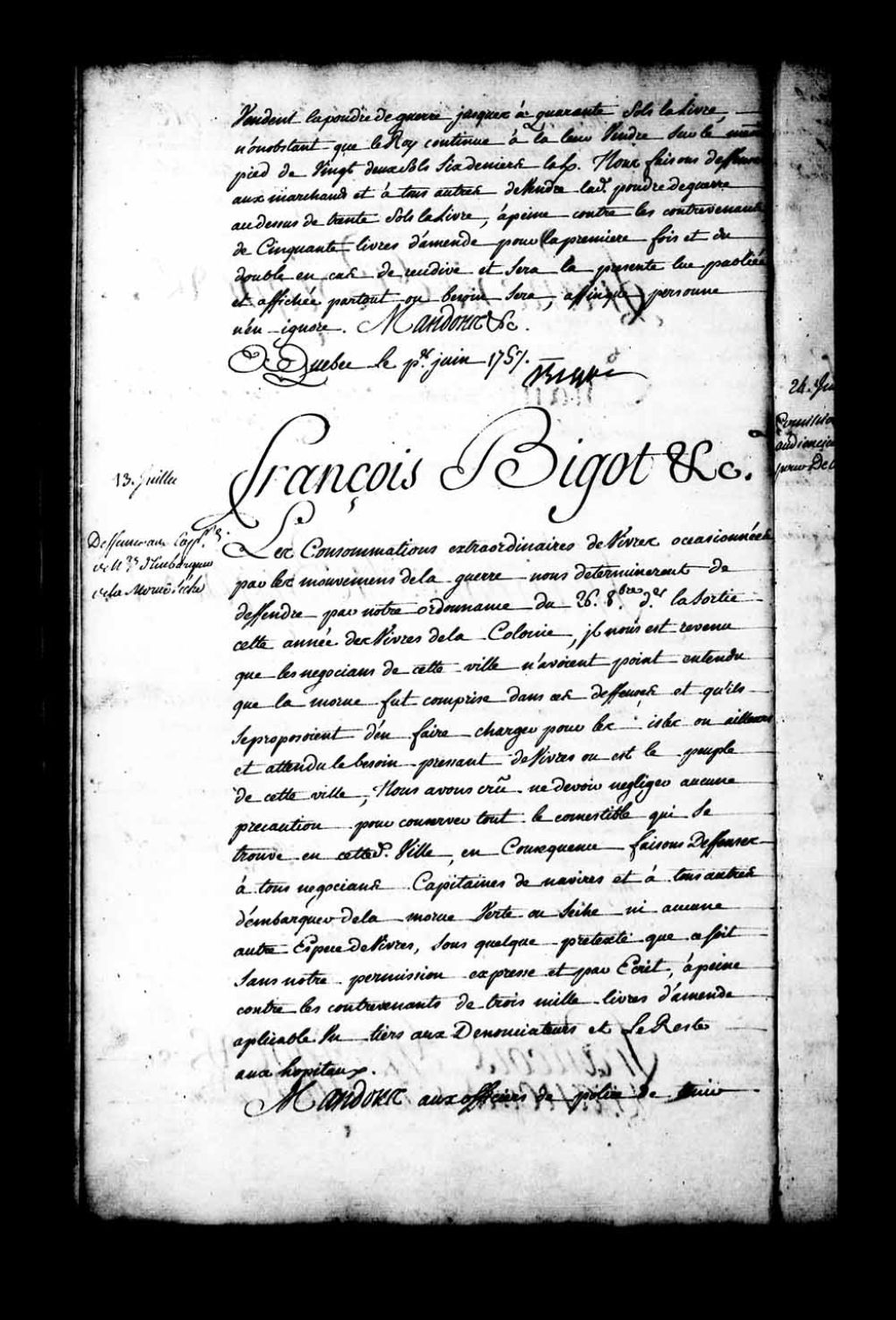 Ordonnance de l'intendant Bigot qui, dans le but de conserver les vivres dans la colonie, fait défense à tous négociants, capitaines de navires et à tous autres d'embarquer de la morue verte ou sèche ni aucune autre espèce de vivres, sous quelque prétexte que ce soit, sans une permission expresse et écrite de l'intendant à peine contre les contrevenants de trois mille livres d'amende applicable un tiers aux dénonciateurs et le reste aux hôpitaux, 13 juillet 1757, Archives nationales à Québec, Fonds Intendants, (03Q,E1,S1,D42,P4254).