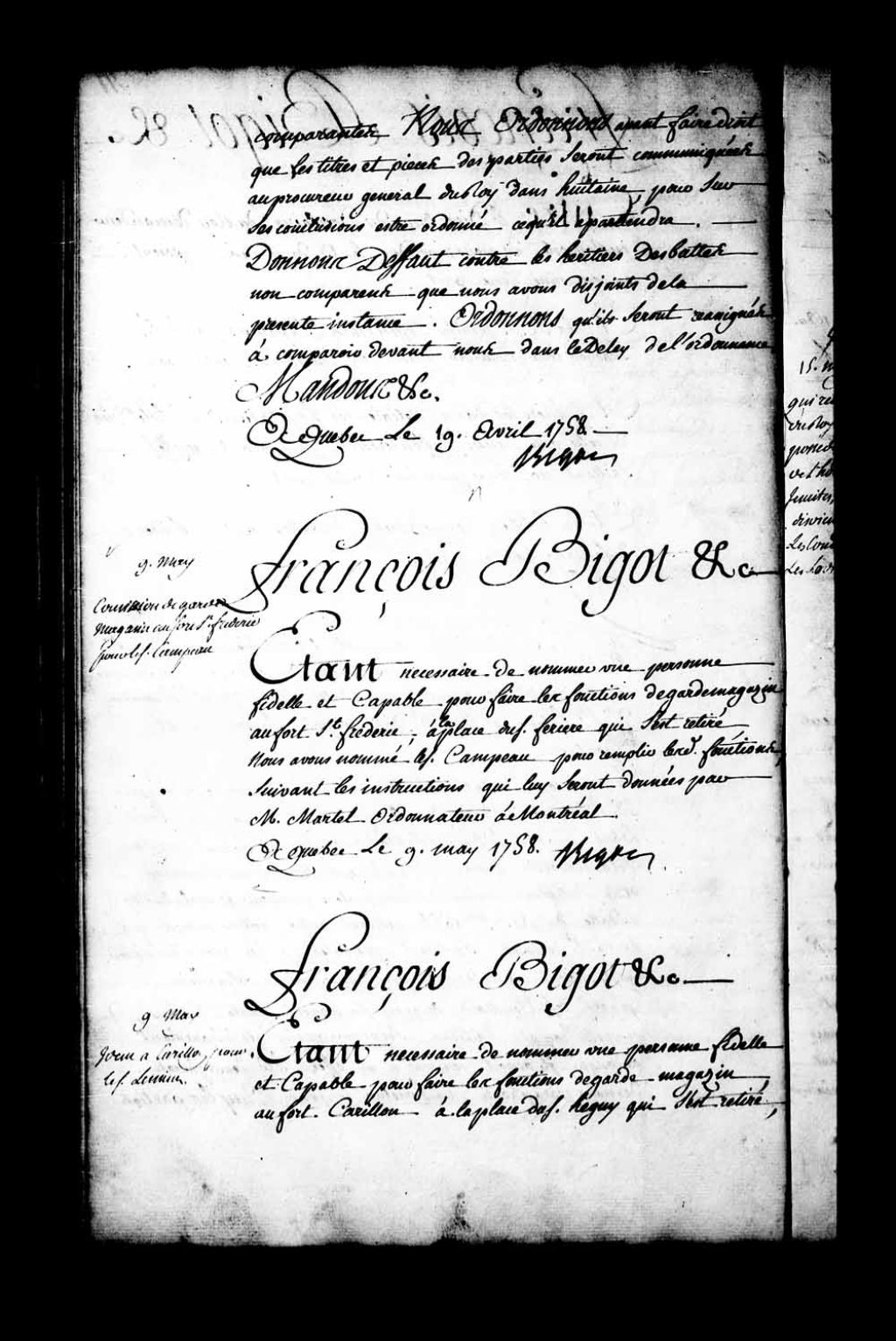 Commission de garde-magasin au fort Saint-Frédéric par l'intendant Bigot pour le sieur Campeau, à la place du sieur Ferière (Laferrière), qui s'est retiré