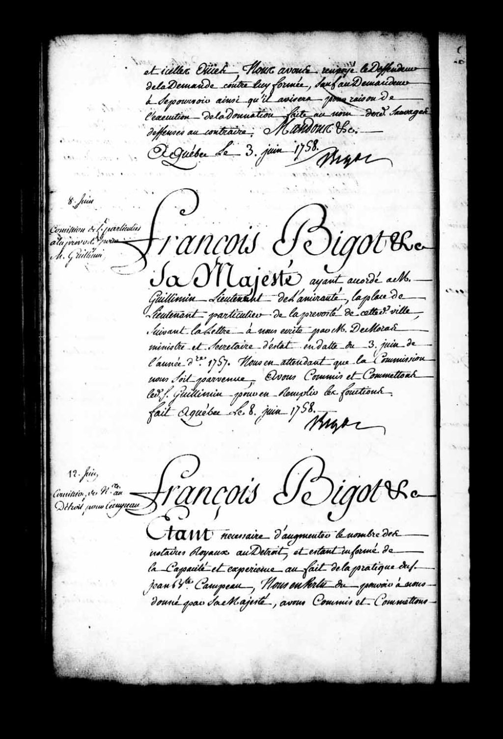 Commission de l'intendant Bigot au sieur Guillimin (Guillemin), lieutenant de l'Amirauté, pour faire les fonctions de lieutenant particulier de la Prévôté de Québec, en attendant sa commission de Sa Majesté annoncée par la lettre de monsieur de Moras (Morase), ministre et secrétaire d’État en date du 3 juin 1757
